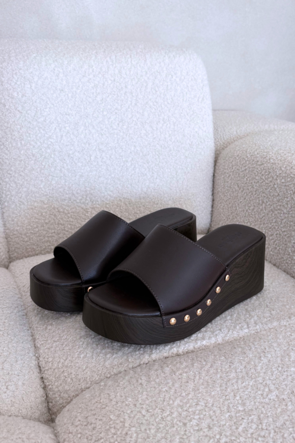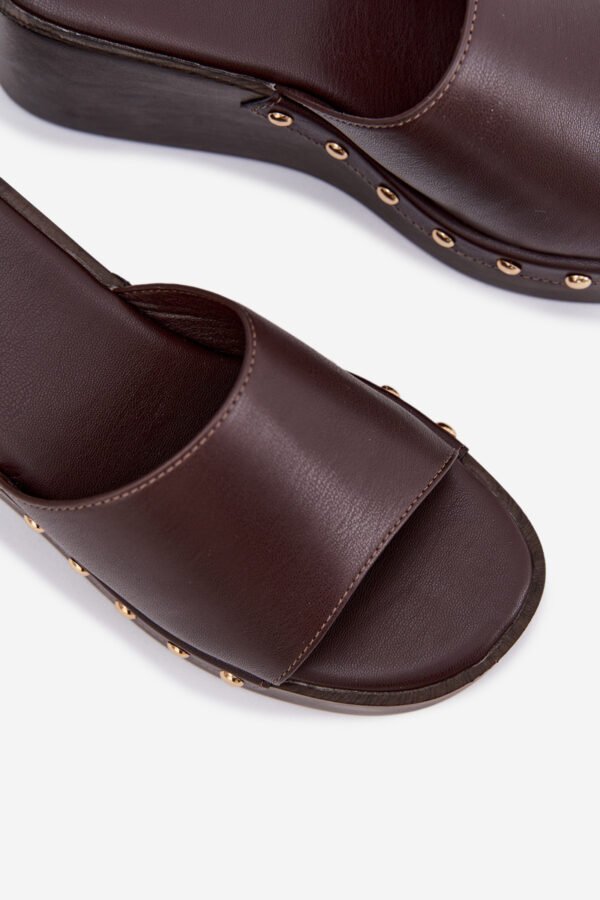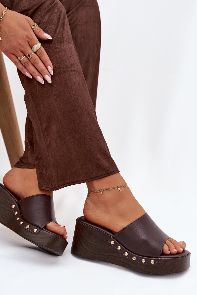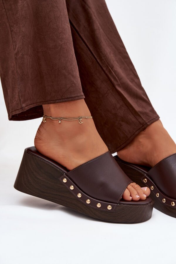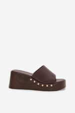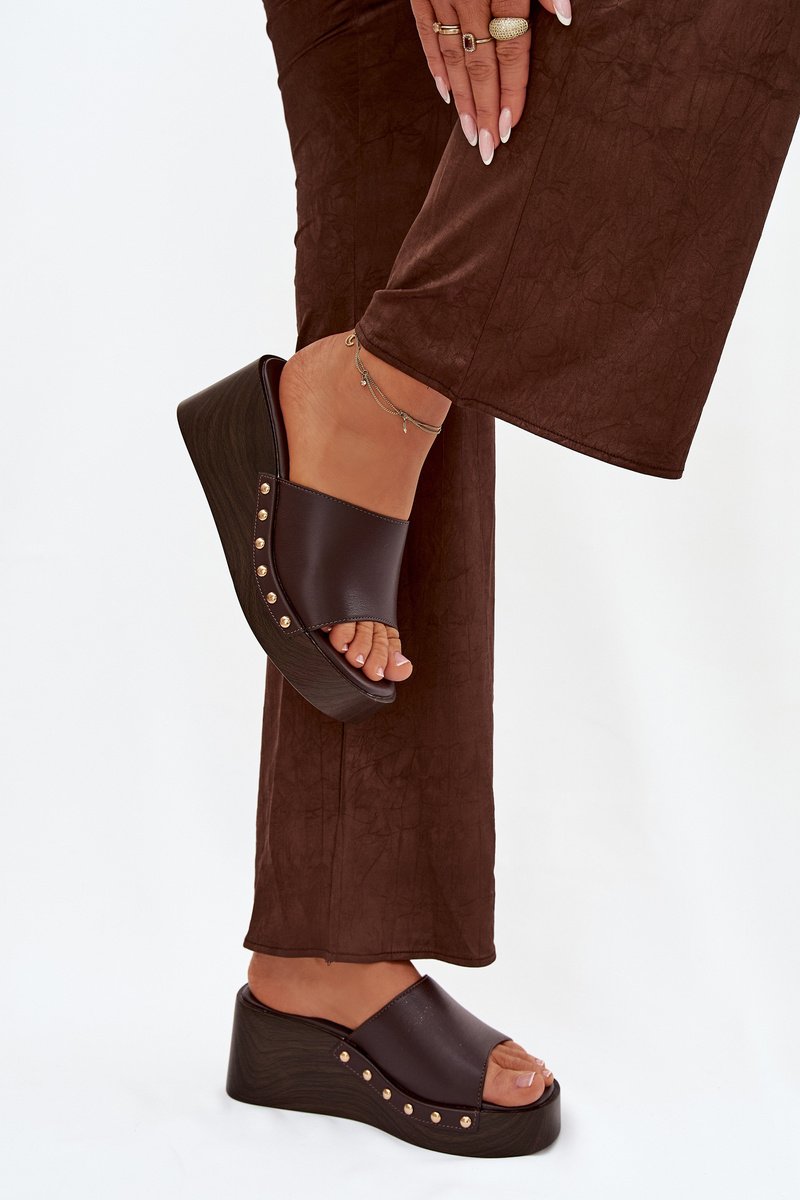 Stilingi moteriški sandalai, pagaminti iš ekologiškos odos. Klininis kulnas užtikrina stabilumą ir komfortą, tuo pačiu subtiliai lieknindamas figūrą. Auksinės kniedės šonuose prideda akį traukiančią detalę. Šis modelis puikiai tinka vasaros aprangai – tiek suknelėms, tiek kasdieniams ansambliams. Tai idealus pasirinkimas moterims, kurios vertina komfortą, derinamą su išskirtiniu, stilingu akcentu.