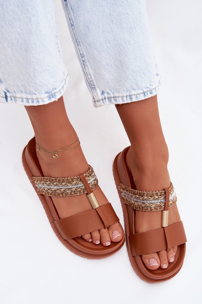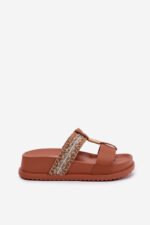 Moteriški platforminiai sandalai su dirželiais ir aukso detalėmis, kamelinės spalvos „Tahlia“