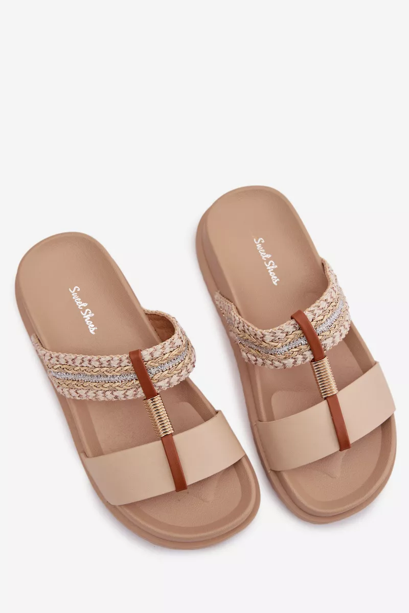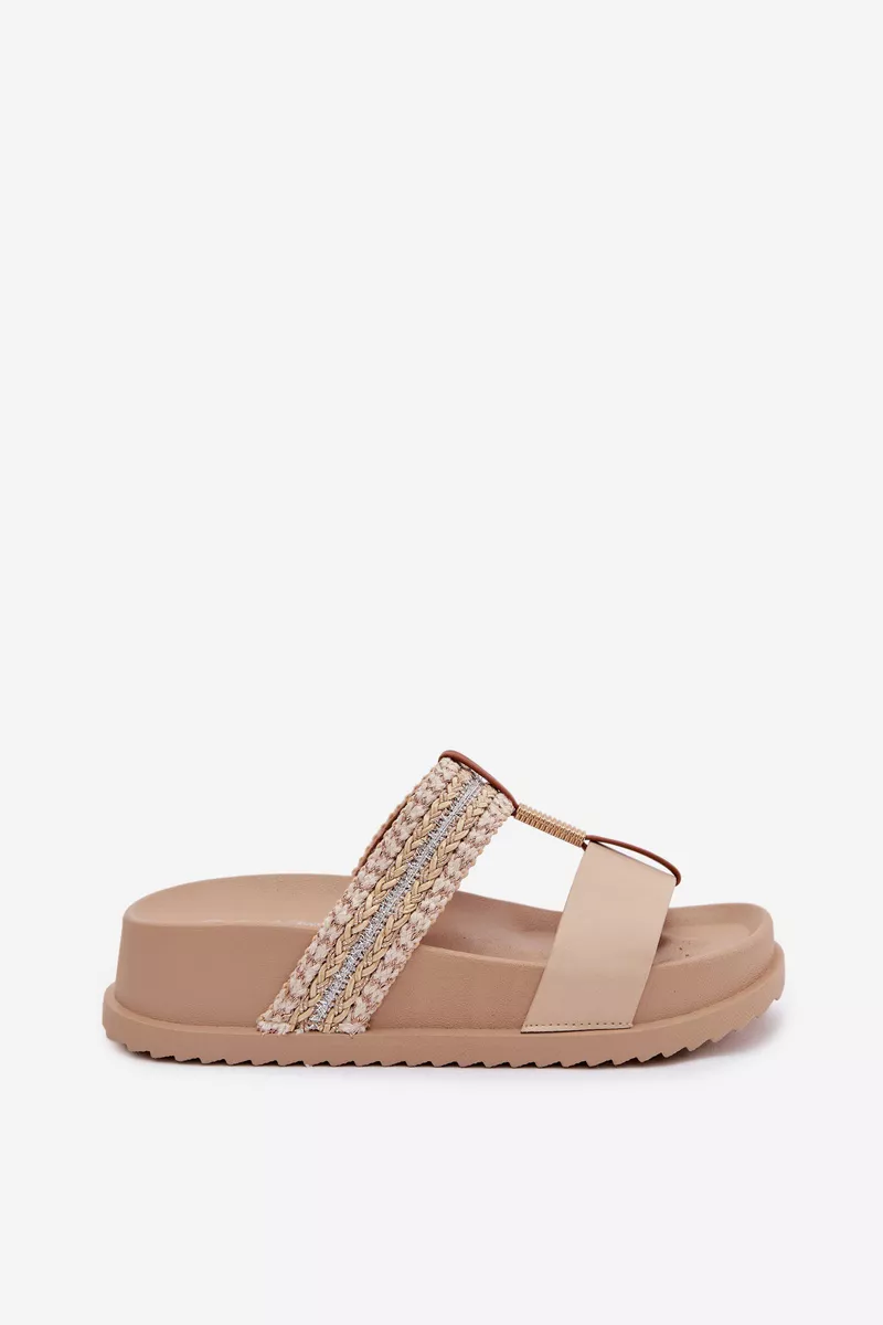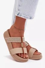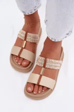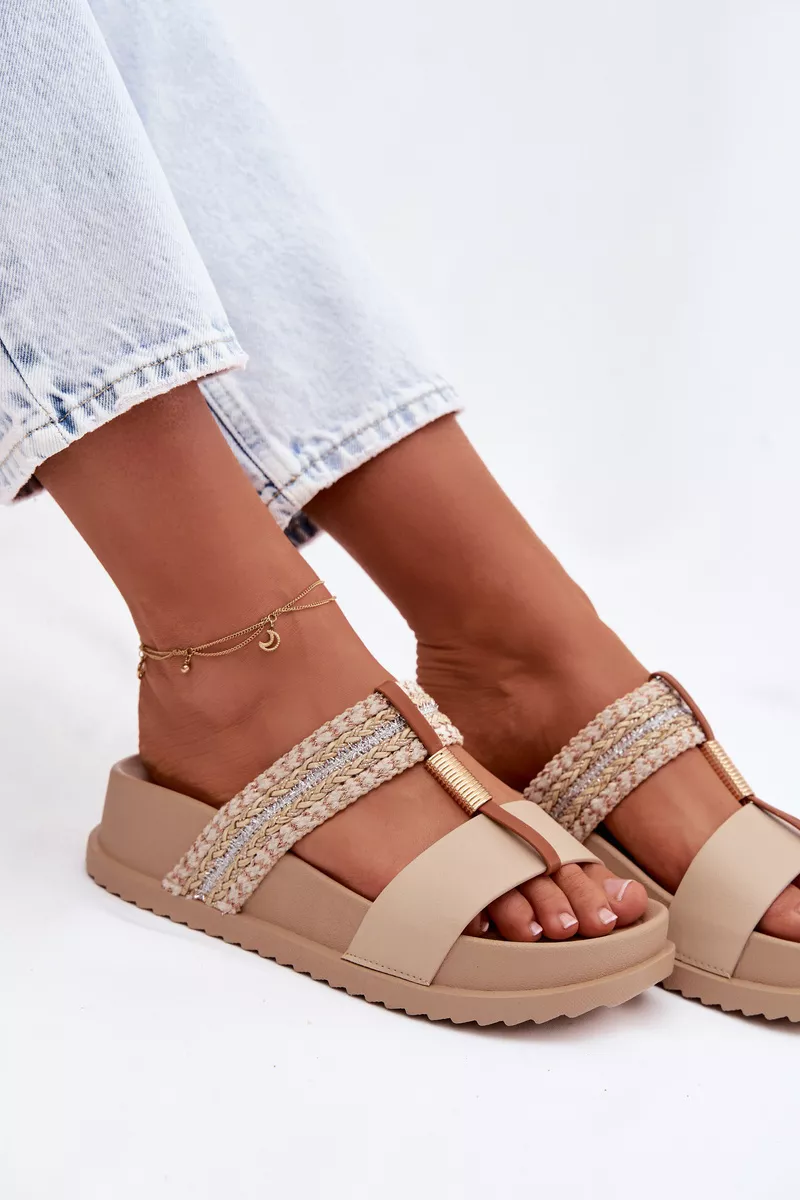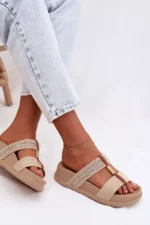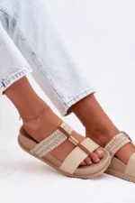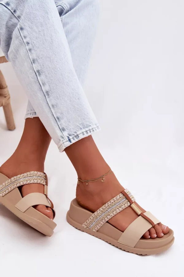 Moteriškos platforminės basutės su dirželiais ir auksiniu akcentu “Beige Tahlia” yra puikus pasirinkimas šiltų dienų aprangai. Šis modelis pasižymi blizgančia pynėtu dirželiu, kuris traukia akį ir suteikia modernų įspūdį. Aukso detalės, jungiančios abu dirželius, yra elegantiškas priedas, pabrėžiantis batų unikalią išvaizdą. Platforma suteikia komfortą ir stabilumą, todėl šios basutės yra idealus pasirinkimas vasaros stiliui. Rinkdamiesi dydį, naudokitės dydžių lentele: 36-22,5/37-23/38-24/39-24,5/40-25/41-25,5 cm.
