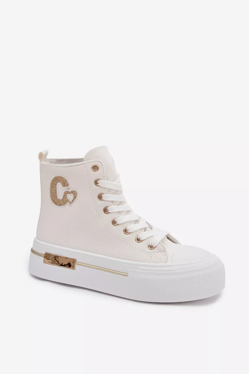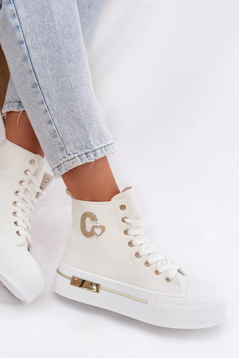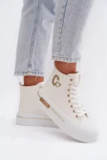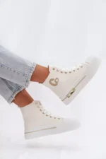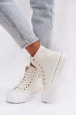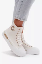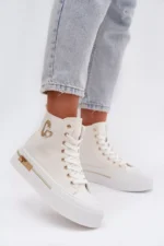 Moteriški sportiniai bateliai su stambia platforma – stilingas pasirinkimas kasdieniam nešiojimui. Stora padas užtikrina komfortą ir stabilumą, o aukso detalės ant platformos suteikia elegantiškumo. Dekoratyvinė aplikacija šone pabrėžia šio modelio madingumą. Renkantis dydį, prašome remtis dydžių lentele.
