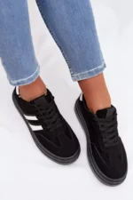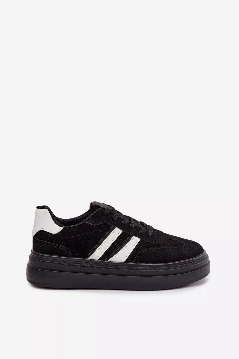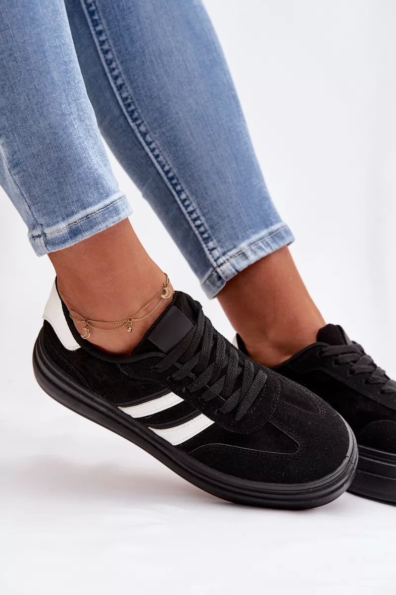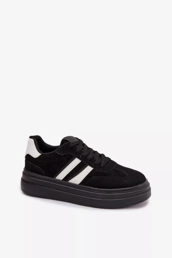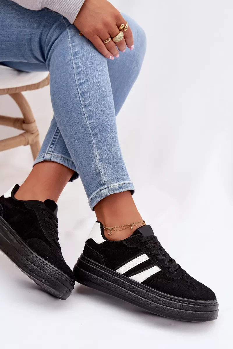Šios elegantiškos moteriškos sportinės juodos platforminės kedės iš Galleria ne tik patrauklios išvaizda, bet ir pasižymi aukšta kokybe bei komfortu. Pagamintos iš aplinkai draugiškos zomšinės medžiagos, šios kedės puikiai tiks kasdieniam nešiojimui. Platforma ne tik suteikia siluetui elegancijos, bet ir užtikrina stabilumą vaikščiojant. Dvi šoninės juostos suteikia sportiškumo ir šiuolaikiško stiliaus. Minkštas putplasčio paminkštinimas užtikrina patogumą visą dieną, todėl šie sportiniai bateliai idealiai tiks ilgoms dienoms.