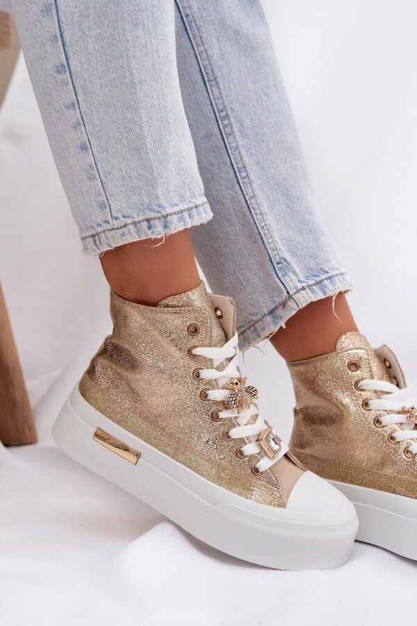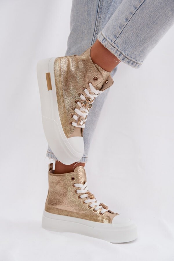 Moteriški sportiniai bateliai su masyviu platformu yra madingas pasirinkimas tiems, kurie mėgsta išraiškingą stilių. Stambus padas suteikia avalynei šiuolaikišką charakterį ir užtikrina patogumą, o auksinis elementas yra akį traukiančios detalės. Raištelių modelis garantuoja gerą pritaikymą prie pėdos, o dekoratyviniai segtukai suteikia originalumo ir madingo įvaizdžio. Šie bateliai puikiai tinka kasdienėms stiliams. Renkantis dydį, vadovaukitės dydžių lentele.