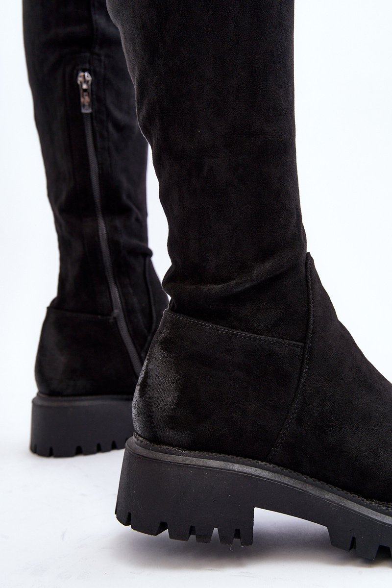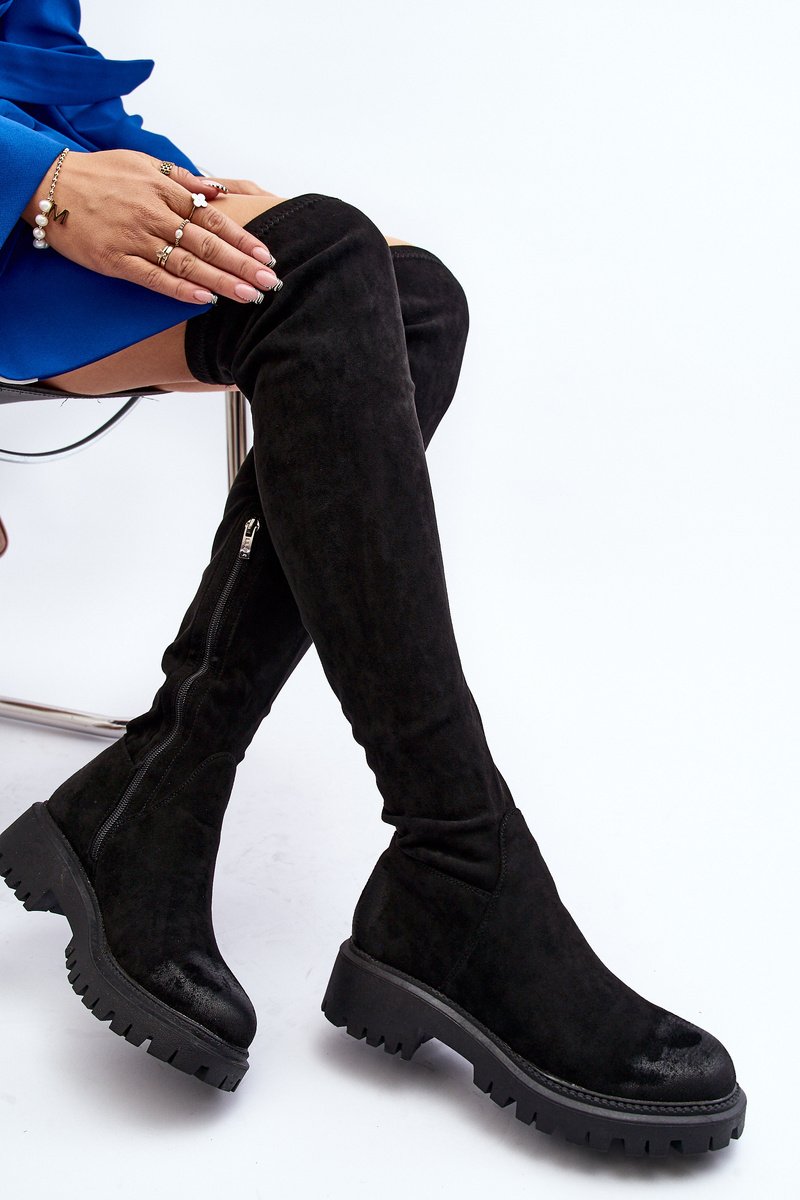 Moteriški ilgaauliai batai, kurių aulas siekia virš kelio. Pagaminti iš eko zomšos. Suformuoti ant plokščio, stabilaus kulno. Apvalūs noseliai. Sustiprintas kulnas. Šiek tiek pašildinti tik pėdos aukštyje su dirbtiniu kailiu. Įsispiriami, su papildomu užsegimu užtrauktuku. Puikiai tinka prie sijonų ir suknelių! Būtinai turėkite juos! Rinkdamiesi dydį, vadovaukitės dydžių lentele.