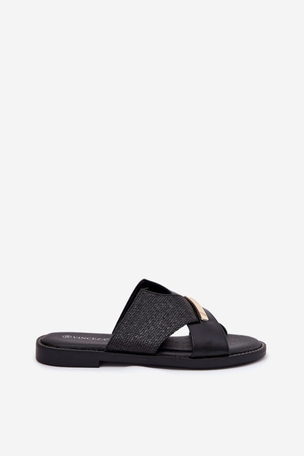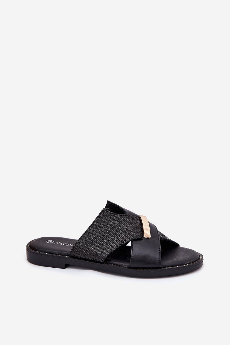 Moteriškos šlepetės, prekės ženklo Vinceza. Pagamintos iš eko odos. Įmontuotos ant plokščio kulno, jos užtikrina komfortą ir stabilumą visą dieną. Priekyje yra dekoratyvus, auksinis elementas. Minkštas vidpadis užtikrina dėvėjimo patogumą, todėl šios šlepetės yra puikus pasirinkimas vasaros įvaizdžiui, tiek kasdieniui, tiek elegantiškesniam. Renkantis dydį, prašome vadovautis dydžių lentele.
