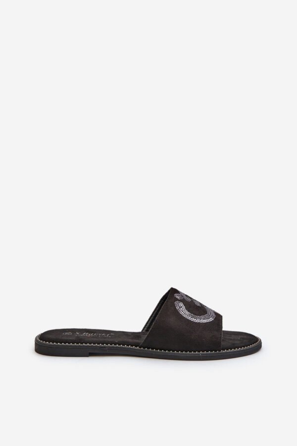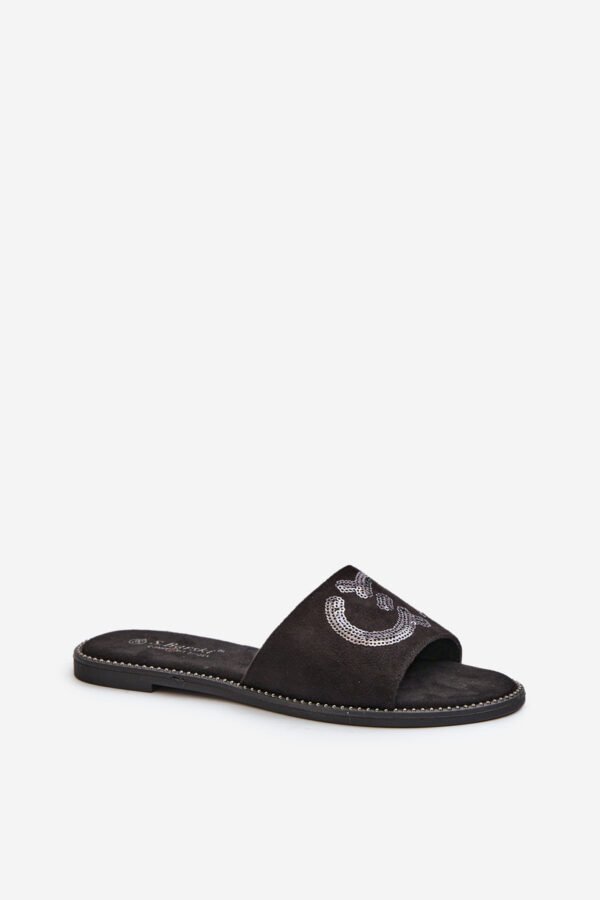 Moteriškos šlepetės pagamintos iš eko zomšo. Įtaisytos ant plokščio kulno. Dekoratyviniai blizgučiai ant dirželio suteikia žavesio. Minkštas „Comfort“ vidpadis leis patogiai avėti avalynę net visą dieną. Puikiai tinka atsitiktinėms (casual) stilizacijoms! Pasirinkdami dydį, prašome vadovautis dydžių lentele.