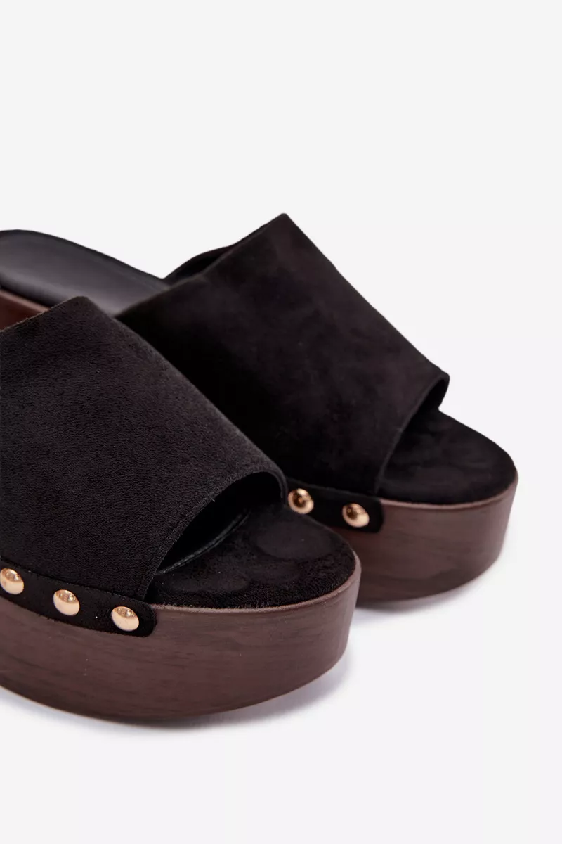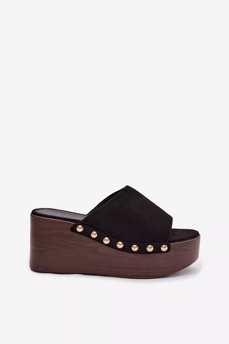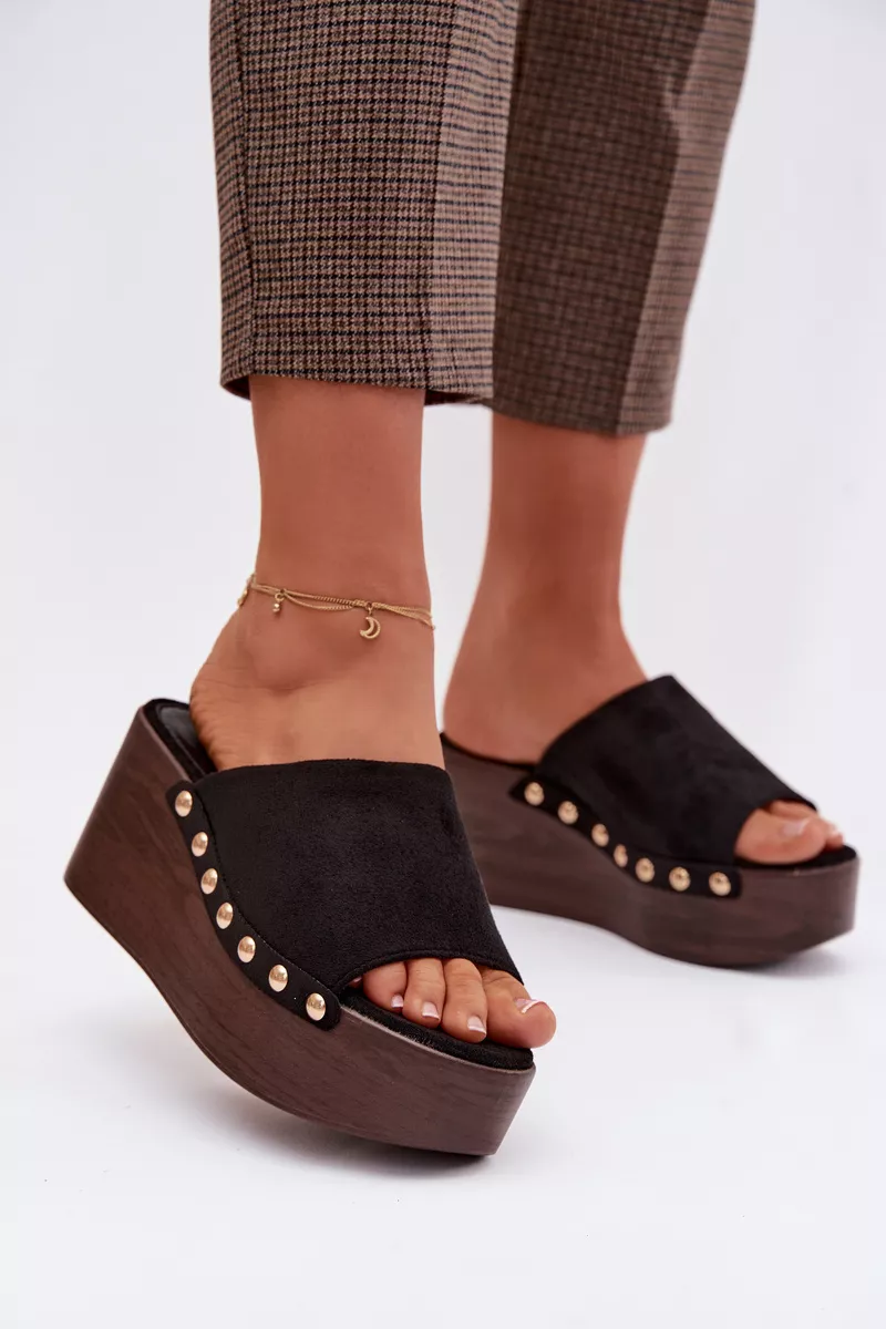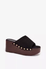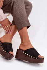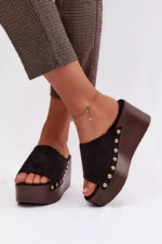 Moteriški ekologiški suede šlepetės yra stilingas pasirinkimas kasdieniam nešiojimui. Klininis kulnas kartu su platforma užtikrina stabilumą ir komfortą, tuo pačiu subtiliai pabrėždamas figūrą. Auksinės kniedės šonuose suteikia madingą akcentą. Šis modelis puikiai tinka vasaros aprangai – su suknelėmis, kelnėmis ar sijonais. Tai idealus pasirinkimas moterims, kurios vertina komfortą ir išskirtinius, stilingus detales. Renkantis dydį, prašome remtis dydžių lentele.