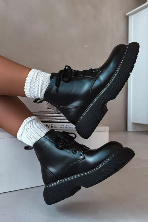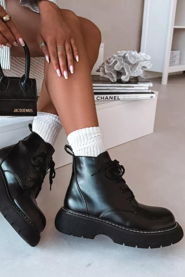 Moteriški juodi “Harmine” platforminiai batai su raišteliais yra puikus pasirinkimas ieškant ko nors stilingo ir patogaus rudenį ar žiemai. Pagaminti iš kokybiškų medžiagų, šie batai ne tik puikiai atrodo, bet taip pat užtikrina maksimalų šilumą ir komfortą šaltomis dienomis. Modernus platforminio pado dizainas su raišteliais suteikia klasikinę išvaizdą, kuri lengvai derinama su įvairaus stiliaus apranga.