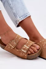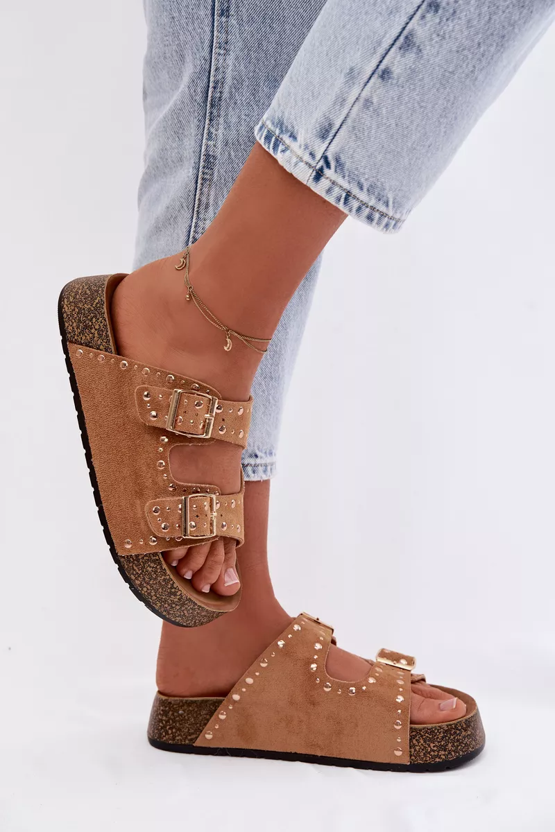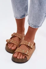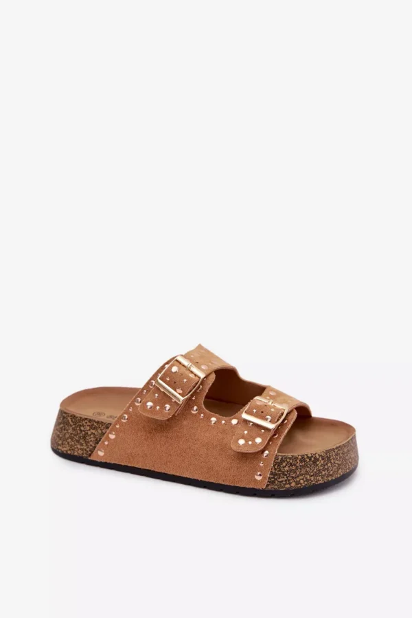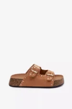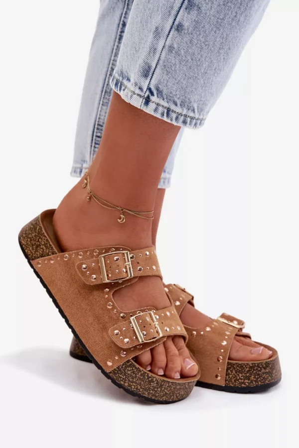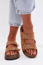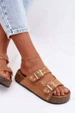 Moteriškos “Camel Tervina” šlepetės su auksiniais spaustukais ir sagutėmis yra elegantiškas ir praktiškas pasirinkimas šiltajam sezonui. Jos pagamintos iš aplinkai draugiškos zomšos, suteikiančios natūralaus stiliaus ir komforto derinį. Korkinė platforma užtikrina patogumą vaikščiojant ir leidžia jausti vasarišką lengvumą. Auksinės detalės papuošia šias šlepetes, suteikdamos madingumo ir išraiškingumo. Šios šlepetės puikiai tiks kasdieniam stiliui, puoškitės jomis tiek prie suknelių, tiek prie laisvalaikio aprangos.