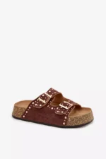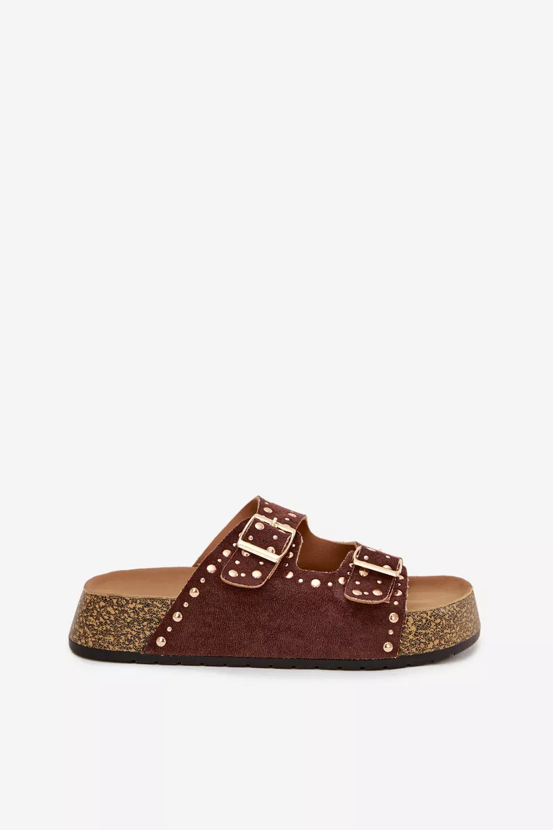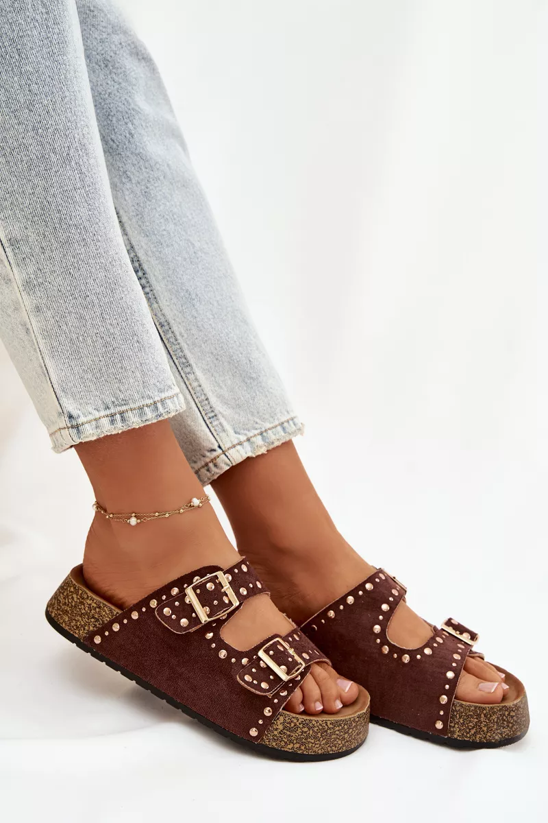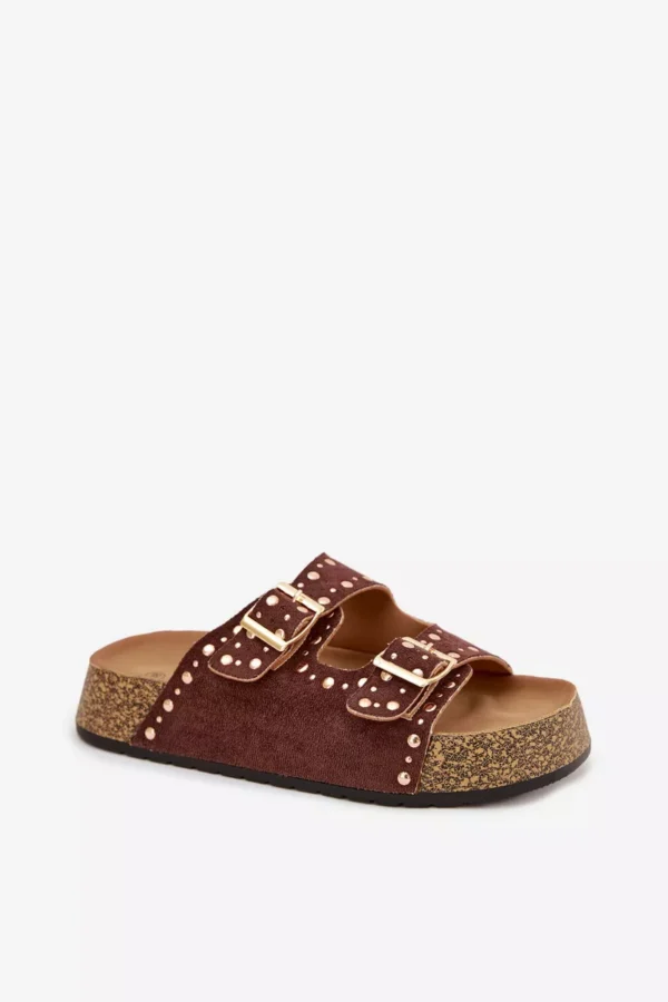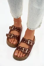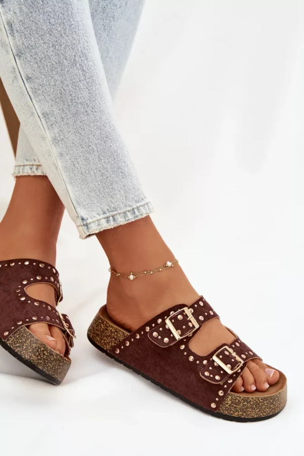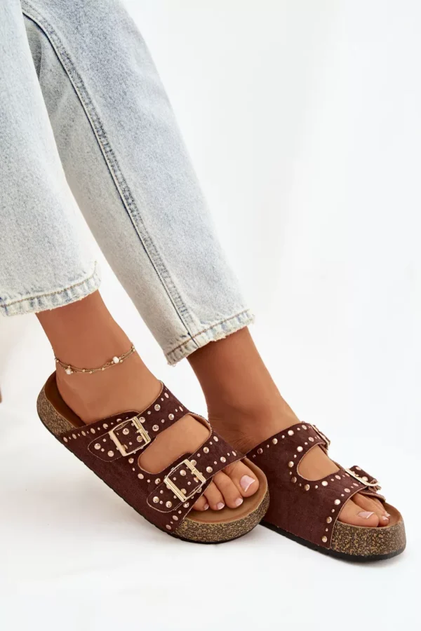 Moteriški šlepetės su auksiniais užsegimais ir sagomis, rudos spalvos „Tervina“