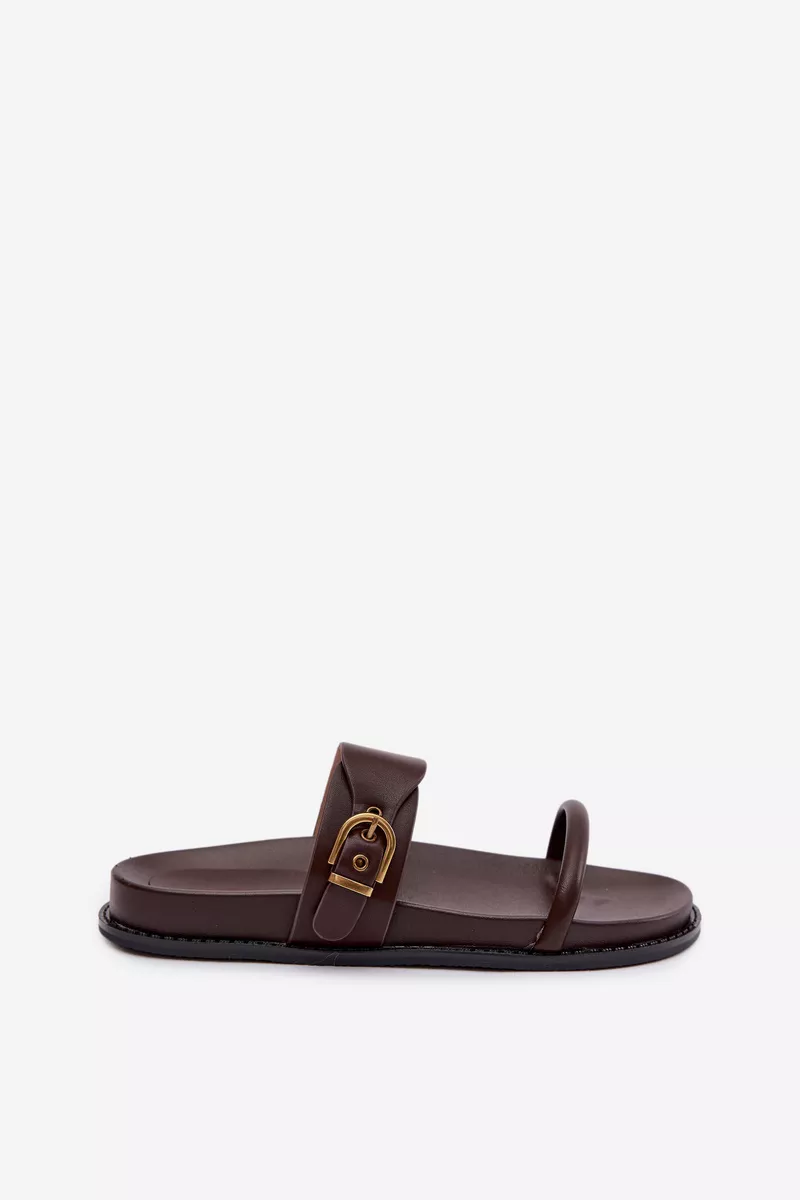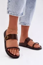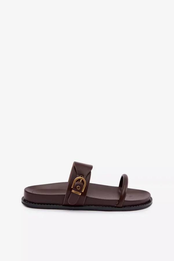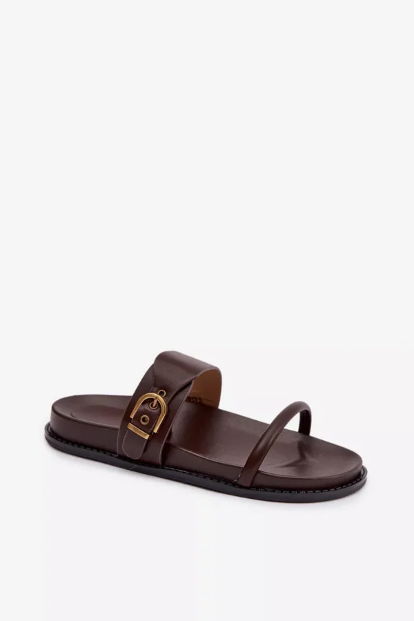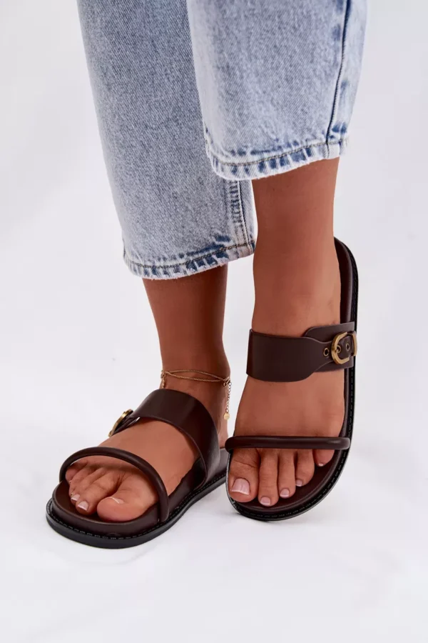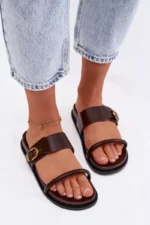 Puiki pasirinkimo galimybė moterims – šokoladiniai Sarilisse sandalai su auksiniu klipsu. Šios originalios moteriškos stiliaus šlepetės yra sukurtos ne tik atrodyti stilingai, bet ir užtikrinti jūsų komfortą visą dieną. Išdirbti iš draugiškos aplinkai odos ir pažymėti elegantišku auksinio klipso akcentu, jie suteikia šiuolaikišką ir moterišką išvaizdą.