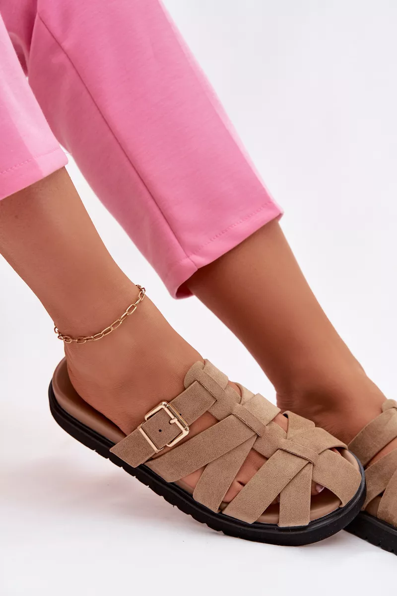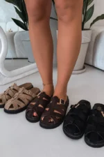 Šlepečių dirželiai, inkrustuoti auksinėmis sagtimis, suteikia elegantiško žavesio, o tamsiai ruda spalva idealiai dera prie įvairių spalvų drabužių. Šios šlepetės gaminamos iš aukščiausios kokybės zomšos, užtikrinančios ilgalaikę naudojimo trukmę.