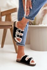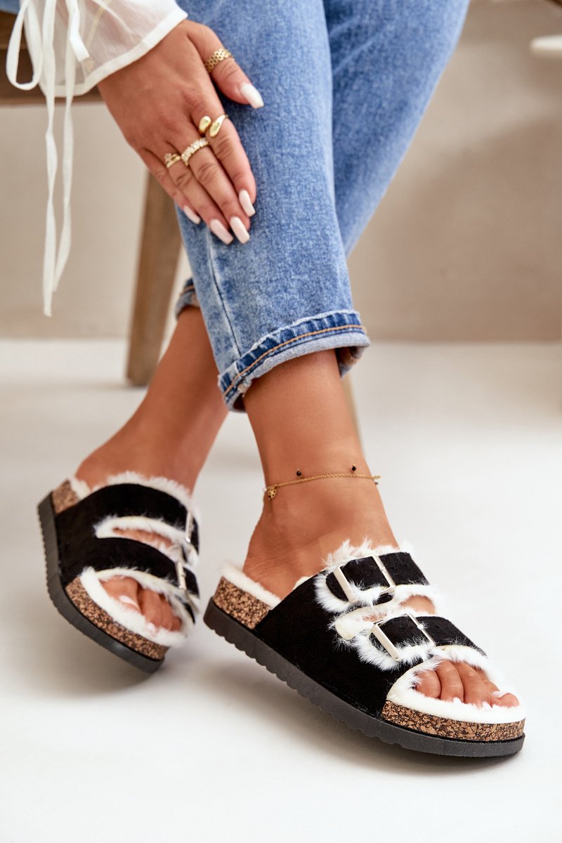 Moteriškos šlepetės, apšiltintos minkštu kailiu, užtikrinančios šilumą ir patogumą šaltesnėmis dienomis. Jos turi du reguliuojamus dirželius su sagtimis, kurie leidžia idealiai priderinti prie pėdos. Platforma suteikia šiek tiek aukščio, kartu užtikrinant stabilumą ir dėvėjimo patogumą. Puikiai tinka jaukiam laisvalaikiui namuose. Renkantis dydį, prašome vadovautis dydžių lentele.