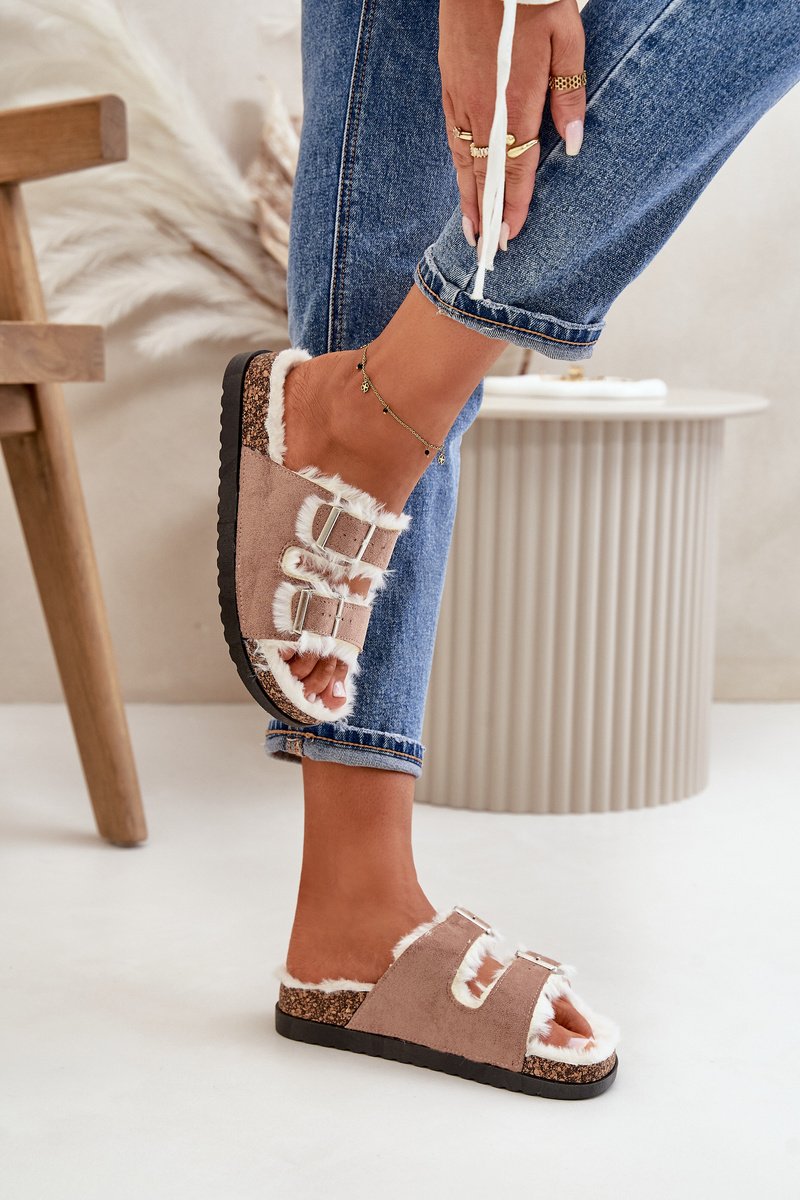 Moteriškos šlepetės, apšiltintos minkštu kailiu, užtikrinančios šilumą ir patogumą šaltesnėmis dienomis. Jos turi du reguliuojamus dirželius su sagtimis, kurie leidžia idealiai priderinti prie pėdos. Platforma suteikia šiek tiek aukščio, kartu užtikrinant stabilumą ir dėvėjimo patogumą. Puikiai tinka jaukiam laisvalaikiui namuose. Renkantis dydį, prašome vadovautis dydžių lentele.