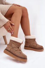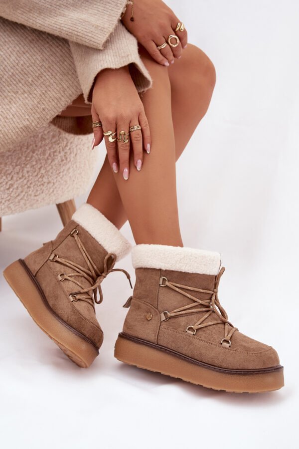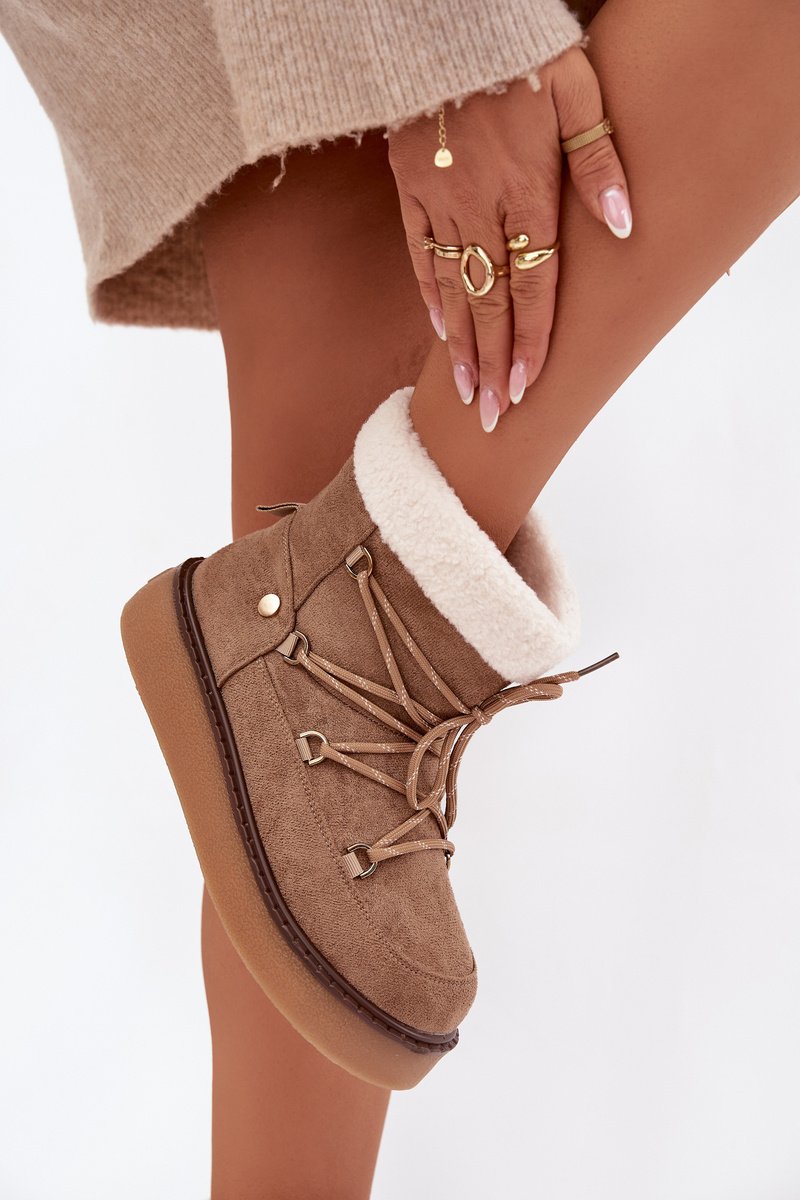 Sniegočiai moteriški, pagaminti iš eko zomšos, yra praktiškas ir stilingas pasirinkimas šaltoms dienoms. Įmontuoti ant tvirto gumos pado, jie užtikrina gerą izoliaciją nuo šalto pagrindo ir stabilumą vaikščiojant. Modelis yra įleistas, o papildomas raištelių suvarstymas leidžia geriau priglusti ir suteikia madingumo. Pašildintas vidus garantuoja šilumą ir komfortą net esant žemai temperatūrai. Puikiai tinka kasdieniam, žieminiam įvaizdžiui. Rinkdamiesi dydį, vadovaukitės dydžių lentele.