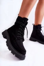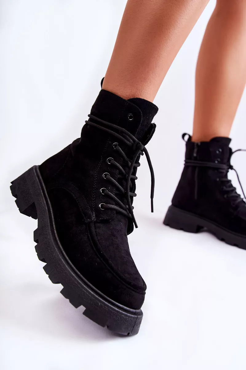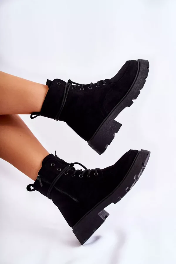 Klasikiniai aulinukai su aulais virš čiurnos pagaminti iš malonaus liesti eko zomšos. Šis modelis turi užtrauktuką aulo šone. Be to, jie yra suvarstomi, o tai leis tinkamai priderinti avalynę prie kojos pločio. Įmontuota ant subtilios platformos ir plokščio kulno. Viduje yra paminkštinimas malonaus liesti kailio pavidalu. Kulnas šiek tiek sutvirtintas. Pasirinkdami dydį, prašome vadovautis dydžių lentele.