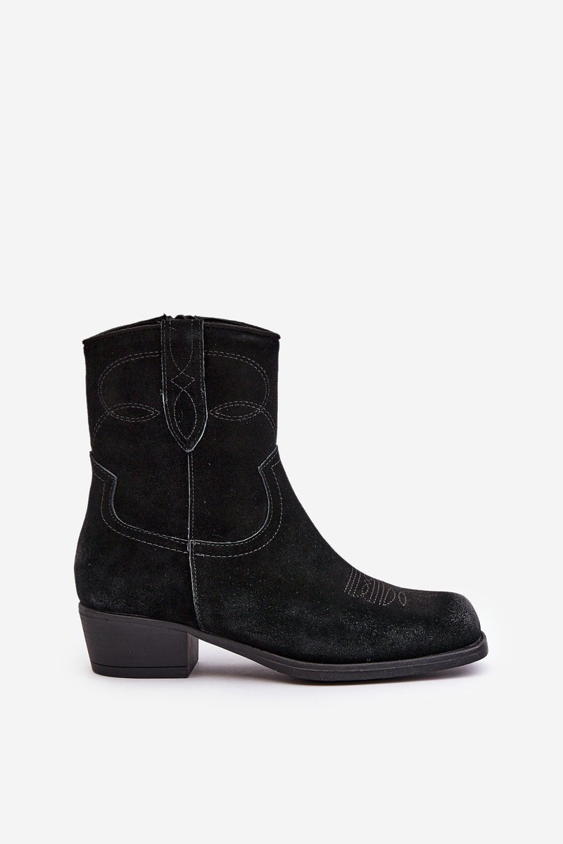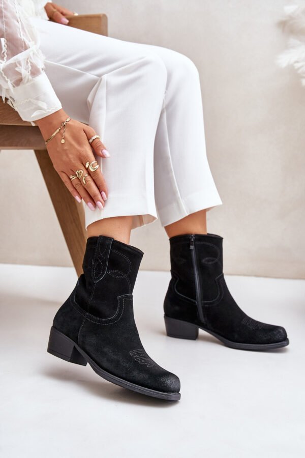 Moteriški kaubojaus stiliaus aulinukai. Pagaminti iš natūralaus zomšo. Įmontuoti ant žemo kulno, kuris užtikrins stabilumą kiekviename žingsnyje. Šis modelis išsiskiria kvadratiniais priekiais ir siūlėmis ant bato aulo. Užsegamas užtrauktuku. Paminkštintas maloniu liesti avikailio pamušalu, kuris sušildys šaltesnėmis dienomis. Nepaprastai madingas dizainas, kurį turėtumėte turėti savo rudens-žiemos garderobe! Renkantis dydį, prašome vadovautis dydžių lentele