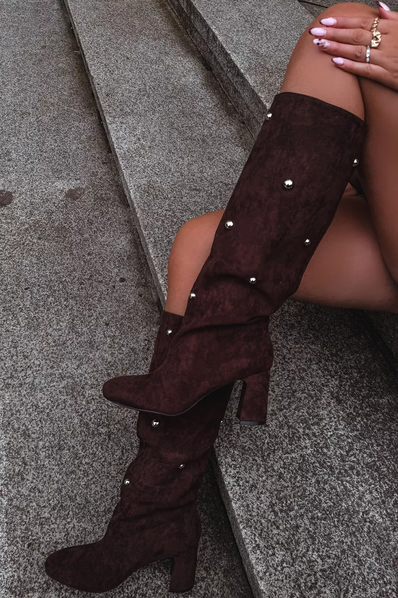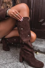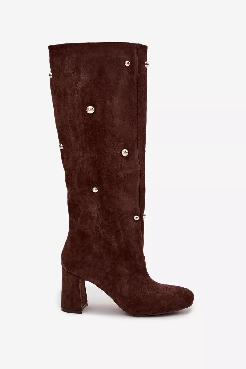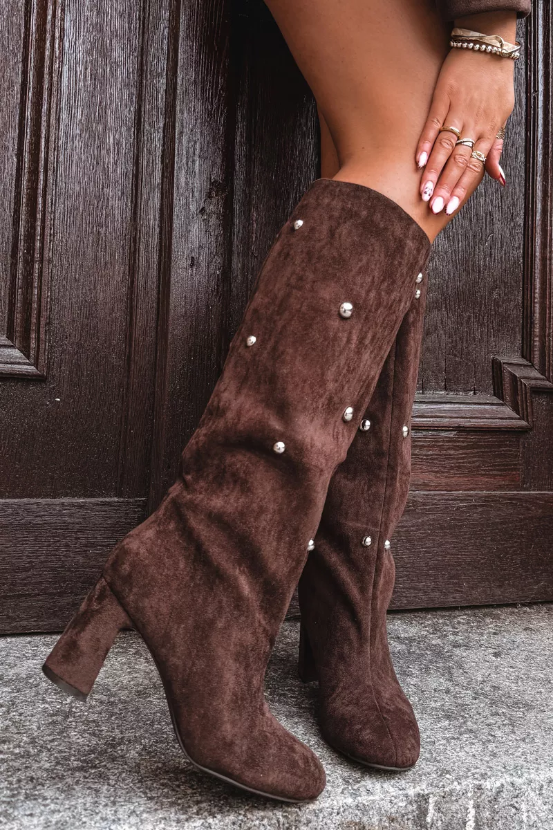 Moteriški žiemos batai su kulnais ir dekoratyviniais elementais Šokoladinis Lucinda