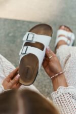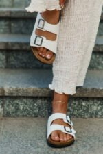 Moteriškos šlepetės pagamintos iš ekologiškos odos. Du dirželiai su sagtimis leidžia lengvai pritaikyti šlepetes prie pėdos, o kamštinis padas suteikia lengvumo ir madingumo. Profiluotas vidpadis garantuoja patogumą visą dieną, todėl šios šlepetės yra puikus pasirinkimas pasivaikščiojimams ar atostogų išvykoms. Komfortas ir stilius viename! Renkantis dydį, prašome vadovautis dydžių lentele.