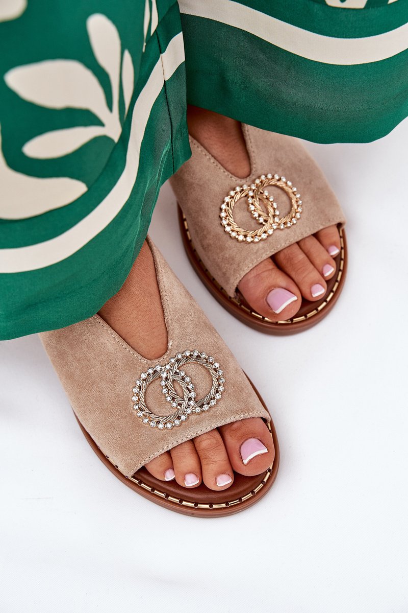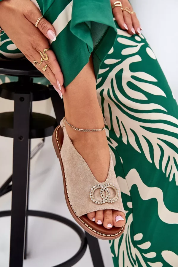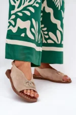 Ekologinio zomšo moteriški sandalai – elegantiškas pasiūlymas šiltoms dienoms. Ant plokščio kulno, užtikrinantys komfortą ir stabilumą. Užsegami reguliuojamu dirželiu su sagtimi, leidžiančiu idealiai priderinti prie pėdos. Priekyje yra puošmena, suteikianti subtilaus elegantiškumo, todėl jie puikiai papildys tiek kasdienes, tiek formalesnes stilizacijas. Renkantis dydį, vadovaukitės dydžių lentele.