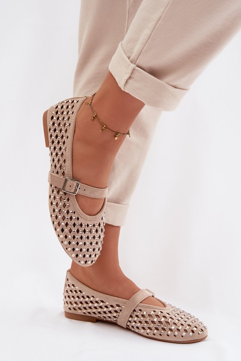 Moteriškos nėrinių balerinos su dirbtiniais brangakmeniais ir dirželiu Bežowe Wilvessa