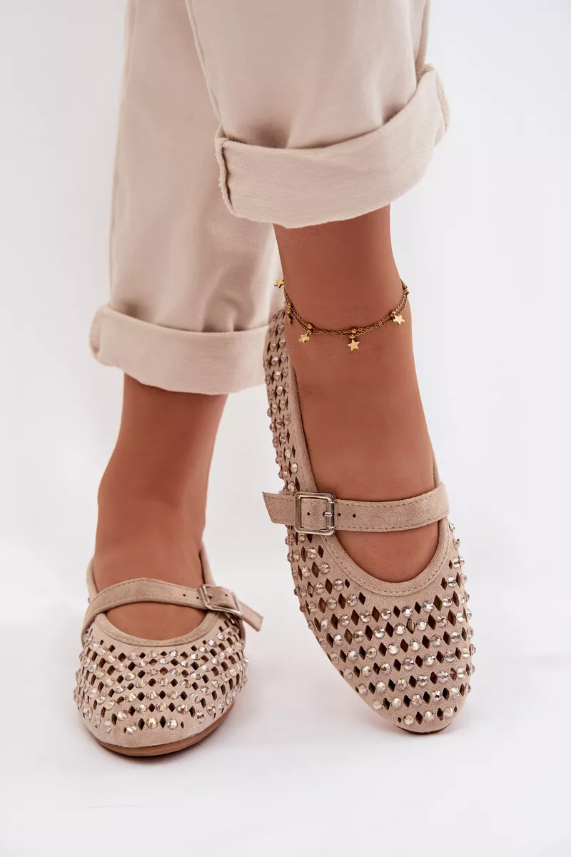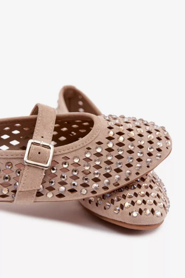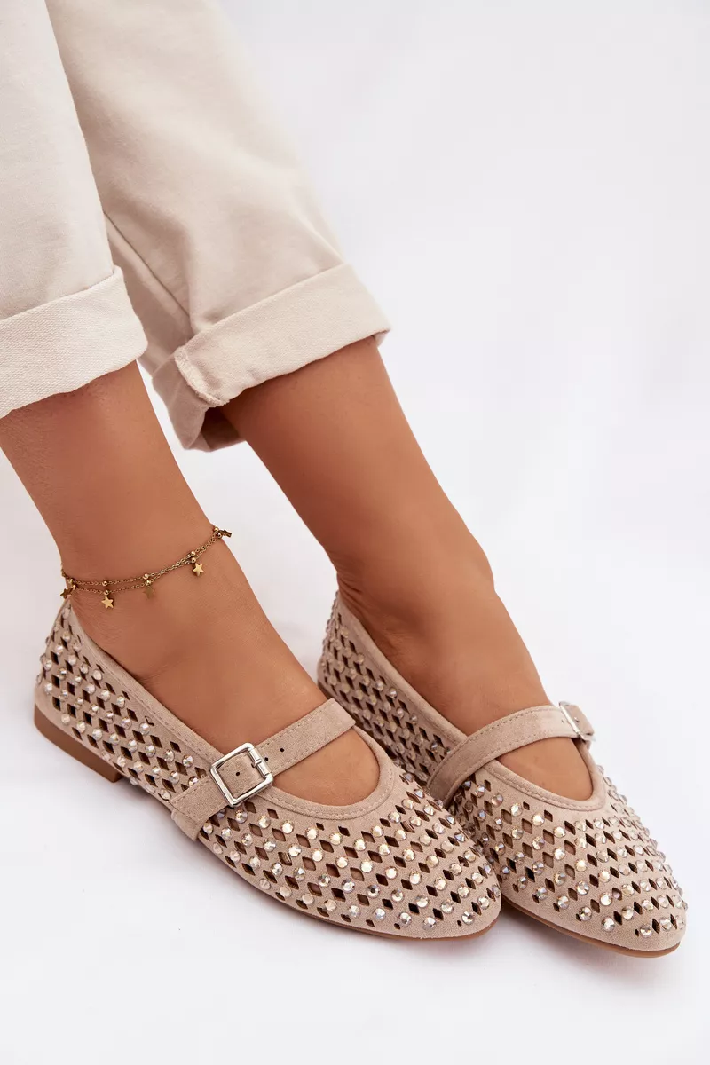 Moteriškos ekologiškos suede balerinos yra stilingas pasirinkimas šiltoms dienoms. Akmens cirkoniu puoštas ažūrinis batelių viršus suteikia jiems subtilų blizgesį. Užsegimas ant pėdos vidurio užtikrina gerą prigludimą ir pabrėžia moterišką modelio charakterį. Apvalūs batelių noseliai papildo klasikinį stilių, todėl balerinos puikiai tinka tiek kasdieniam, tiek elegantiškesniam aprangos stiliui. Renkantis dydį, prašome remtis dydžių lentele.