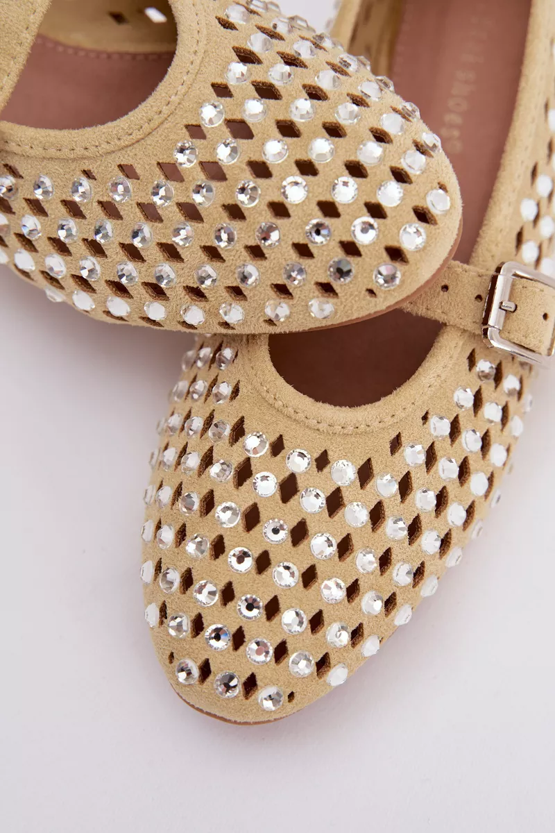 **Moteriškų balerinų bateliai su ažūriniais elementais ir kristalais – rafinuotas stiliaus pasirinkimas šiltuoju metų sezonu. Sukurti iš aukštos kokybės zomšos, jie suteikia elegancijos ir modernumo pojūtį.** Šie bateliai yra ne tik patogūs, bet ir ekologiški – medžio efektą imituojantis pagrindas užtikrina ilgaamžiškumą ir tai, kad koja jaustųsi patogiai net ir po ilgų vaikščiojimo valandų.