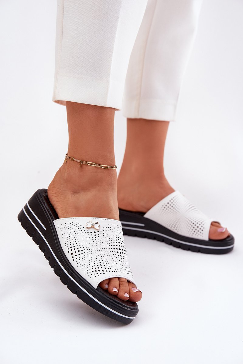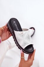 Moteriškos šlepetės, pagamintos iš natūralios odos, yra elegantiškas ir patogus pasirinkimas šiltoms dienoms. Jų platforma užtikrina stabilumą ir patogumą visą dieną. Šone ant dirželio yra subtilus dekoratyvinis elementas, suteikiantis joms išskirtinumo. Odos vidpadis garantuoja dėvėjimo komfortą, todėl šios šlepetės yra puikus pasirinkimas vasaros įvaizdžiams. Idealiai tinka kasdienai. Renkantis dydį, prašome vadovautis dydžių lentele.