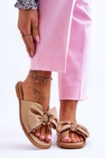 Klasikinio kirpimo moteriškos šlepetės. Pagamintos iš eko odos. Madinga kokarda su puošmena priekyje suteikia šlepetėms neįtikėtiną išvaizdą! Minkštas vidpadis yra patogus naudoti ir taip pat pagamintas iš eko odos. Atviras, kvadratinis priekis. Šlepetės yra su plokščiu kulnu. Madingos ir patogios naudoti – tiesiog privalote jas turėti. Rinkdamiesi dydį, vadovaukitės dydžių lentele.
