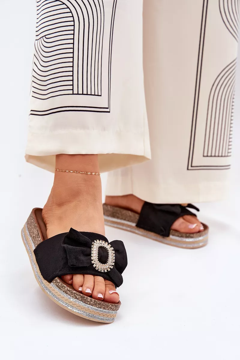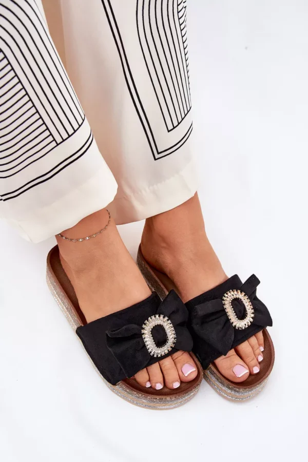 Šios moteriškos sandalai ant platformos su puošnia juoda dekoro sagtimi – tai privalomas aksesuaras kiekvienos mados mėgėjos spintoje. Pagamintos iš ekologiško zomšo, šios sandalai užtikrina ne tik eleganciją, bet ir tvarumą. Plati platforma suteikia stilingą išvaizdą ir patogumą visą dieną, o juoda bantės detalė priekiniuose ruožuose pasaldina kiekvieną žingsnį su švelniu moteriškumo prisilietimu.