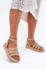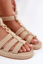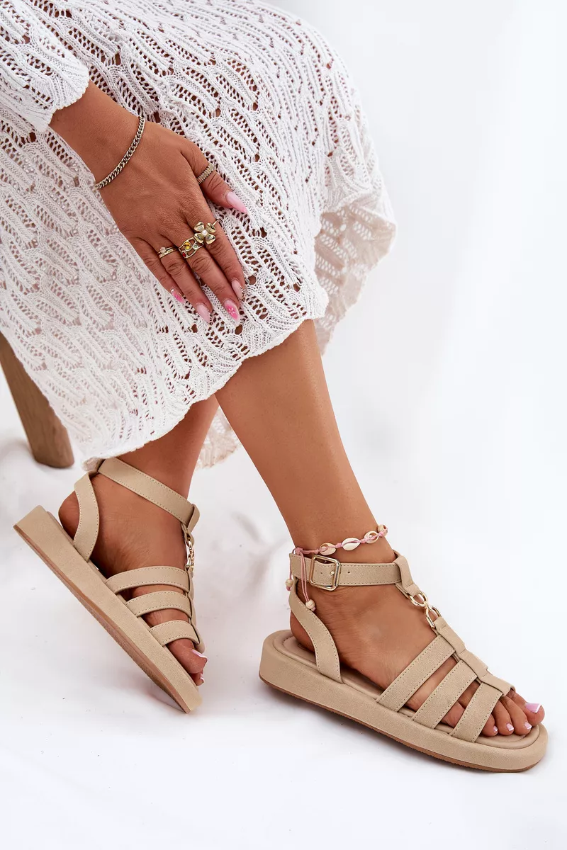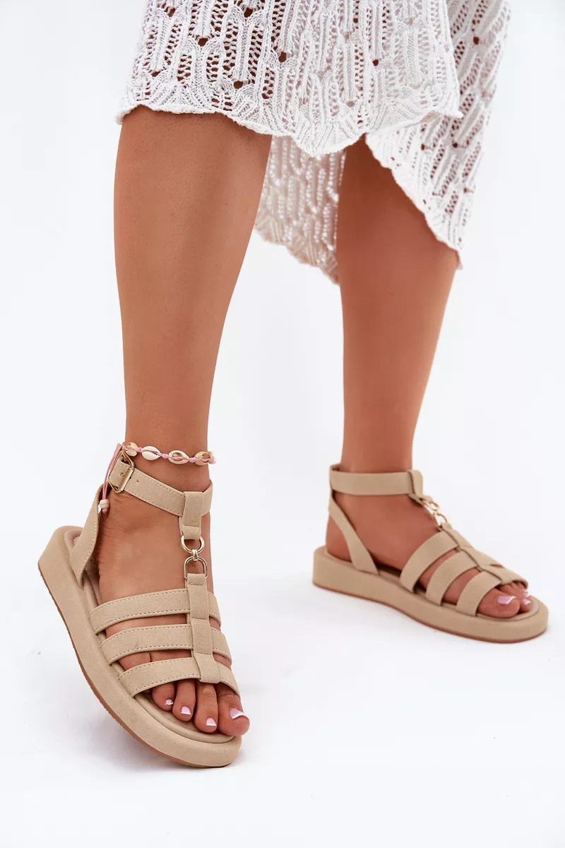 Moteriški sandalai pagaminti iš eko zomšos. Įmontuoti ant subtilios platformos, jie užtikrina patogumą ir stabilumą visą dieną. Sagtis su reguliuojamu dirželiu leidžia idealiai priglusti prie pėdos. Priekyje yra subtilus auksinis elementas, jungiantis dirželius. Minkštas vidpadis užtikrina komfortą vaikščiojant. Puikiai tinka tiek prie suknelių, tiek prie kelnių, sukuriant stilingą įvaizdį bet kokiai progai. Rinkdamiesi dydį, vadovaukitės dydžių lentele.