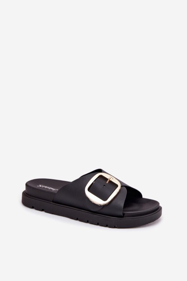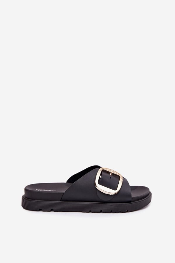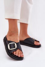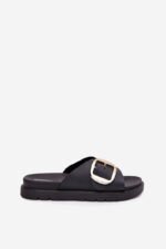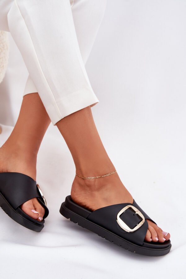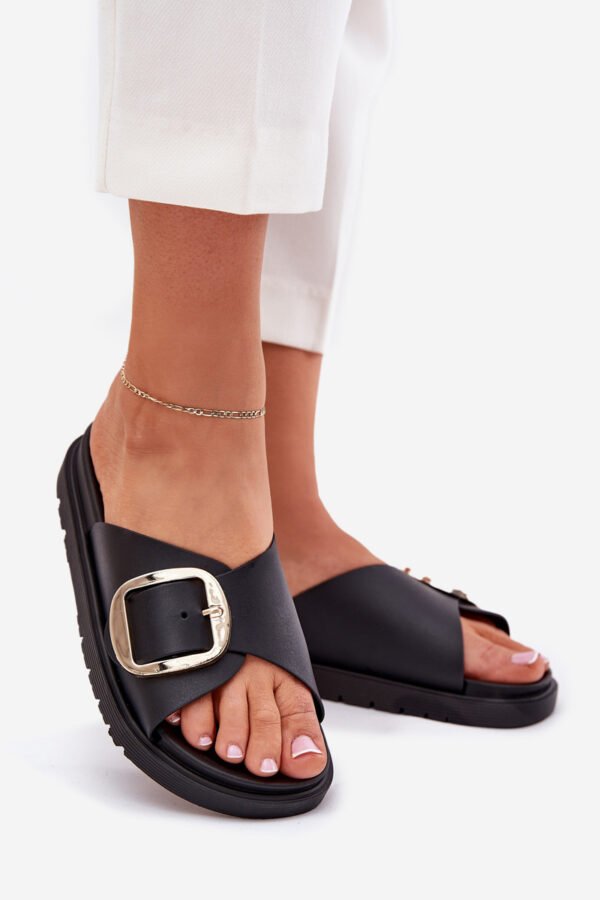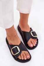 Moteriškos šlepetės pagamintos iš gumos. Įmontuotos ant platformos. Didelė auksinė sagtis suteikia joms elegancijos ir išskiria jas iš kitų modelių. Idealiai tinka kasdienai, puikiai dera prie vasariškų įvaizdžių, užtikrinant patogumą ir madingą išvaizdą. Pasirinkdami dydį, vadovaukitės dydžių lentele.