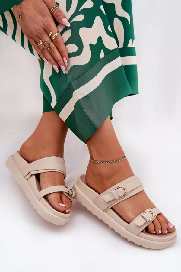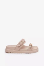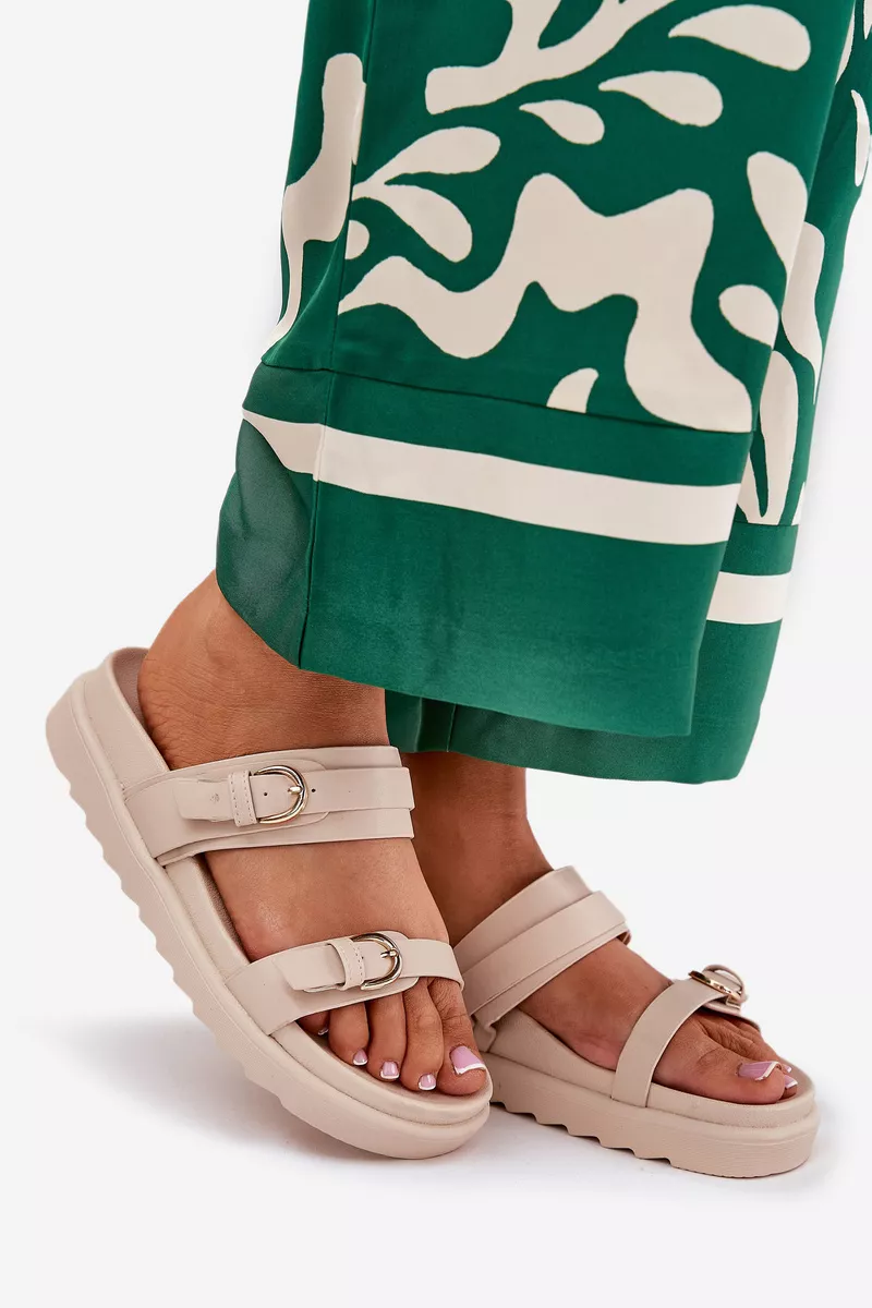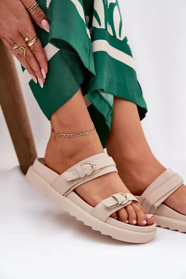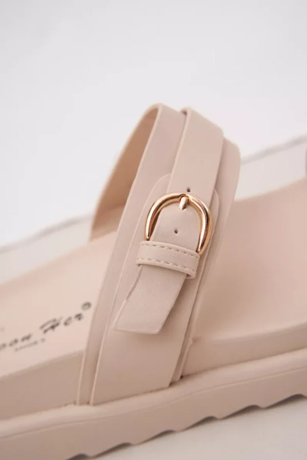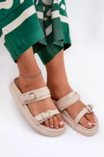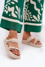 Dėvėdamos šias damų platforminius sandalais pasijusite stilingai ir patogiai. Dviejų aukso spalvos sagtelių dekoracija suteikia avalynei ypatingą žavesį, o natūralių atspalvių ruda spalva puikiai dera prie įvairių drabužių derinių. Plati platforma suteikia stabilumo ir lengvumo žingsnį, todėl jos puikiai tinka tiek kasdieniam, tiek šventiniam stiliui.