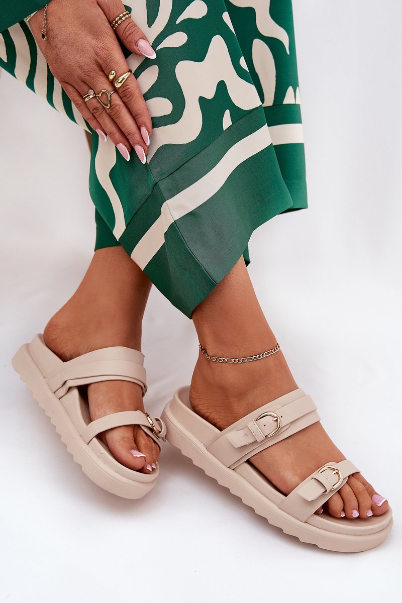 Stilingos moteriškos platforminės šlepetės, puikiai derinančios komfortą su modernia išvaizda. Priekinėje dalyje šlepetės turi du dirželius su sagtimis, suteikiančius joms charakterio ir subtiliai atkreipiančius dėmesį. Platforma garantuoja pasitikėjimą žingsniu ir stabilumą visą dieną. Puikiai tinka kasdienai, puikiai dera tiek su suknelėmis, tiek su kelnėmis, sudarydamos universalią kiekvienos vasaros spintos dalį. Renkantis dydį, prašome vadovautis dydžių lentele.