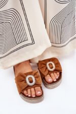 Šlepetės pagamintos iš eko zomšos. Priekyje – kaspinas ir dekoratyvinė sagė. Įrengtos ant platformos su blizgučiais, kuri suteikia kiekvienai stilizacijai šiek tiek blizgesio ir elegancijos. Šios šlepetės puikiai tiks vasaros dienoms, derės prie suknelių, sijonų ar šortų, suteikdamos kiekvienai išvaizdai modernų akcentą. Renkantis dydį, prašome vadovautis dydžių lentele.