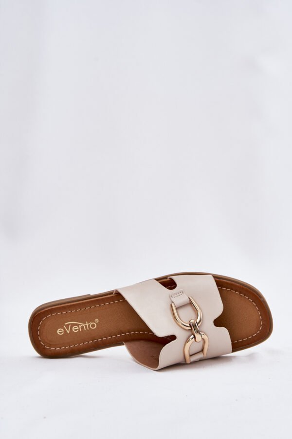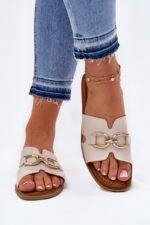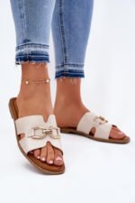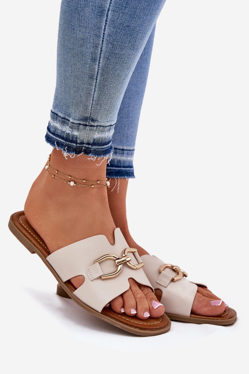 Moteriškos šlepetės pagamintos iš eko odos. Įtvirtintos ant plokščio kulno, jos užtikrina patogumą dėvint visą dieną. Priekyje yra subtilus, auksinis dekoratyvinis elementas, suteikiantis joms ypatingo charakterio. Idealios kasdieniam dėvėjimui, puikiai dera su atsitiktiniais drabužiais. Renkantis dydį, prašome vadovautis dydžių lentele.