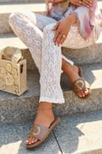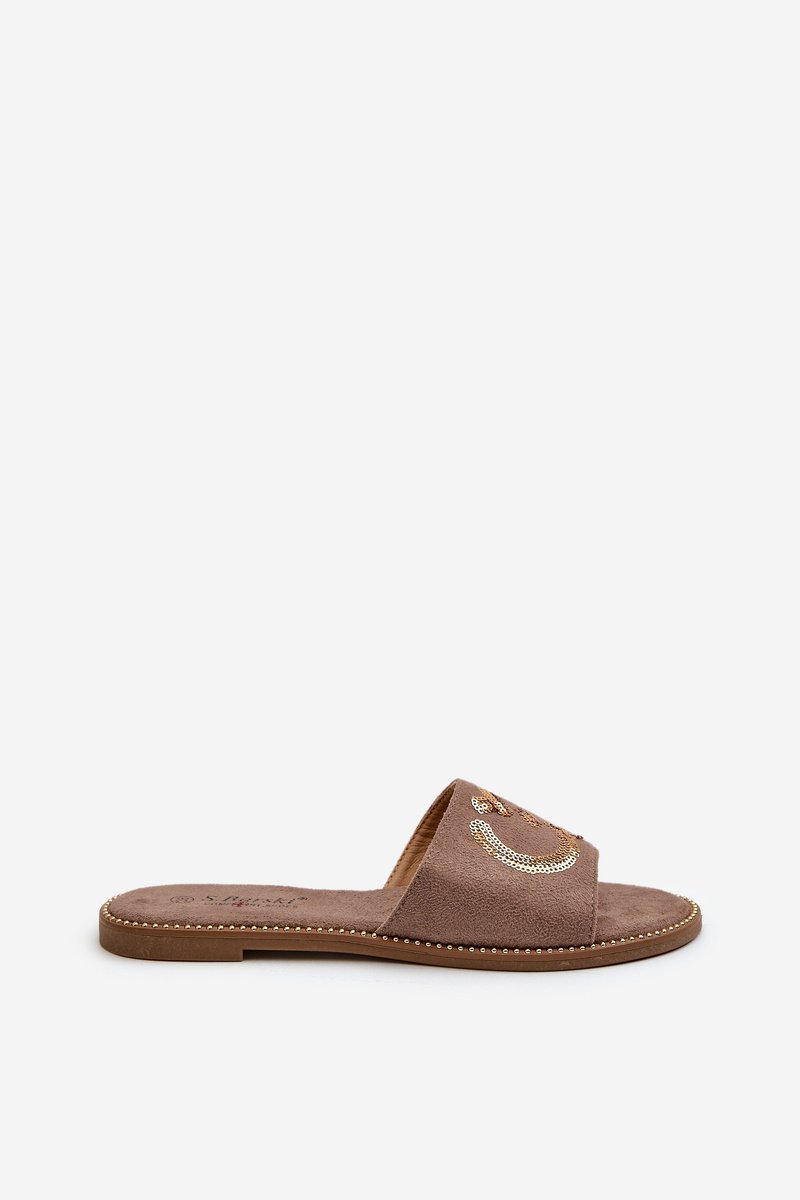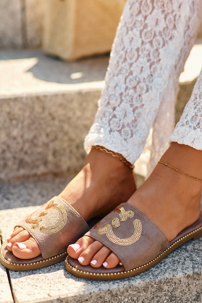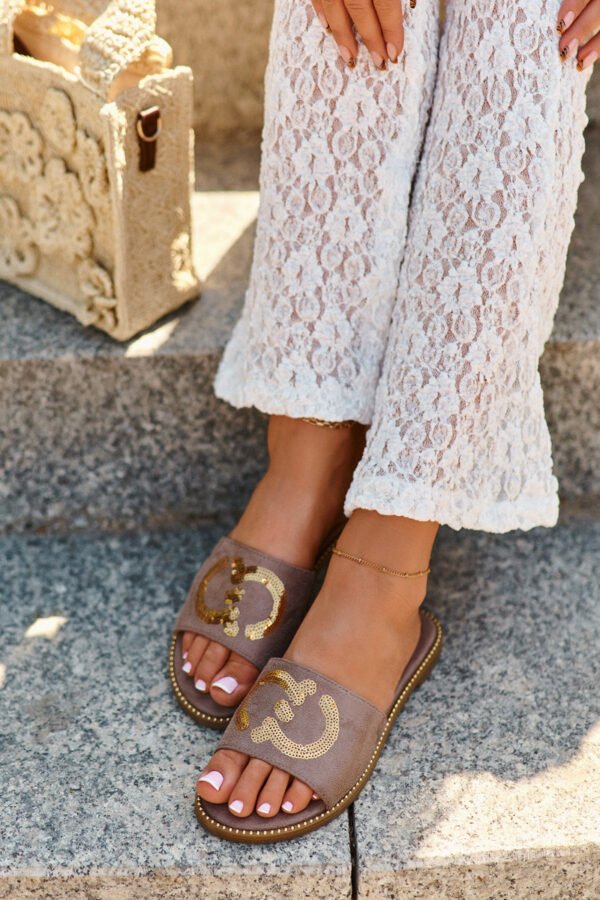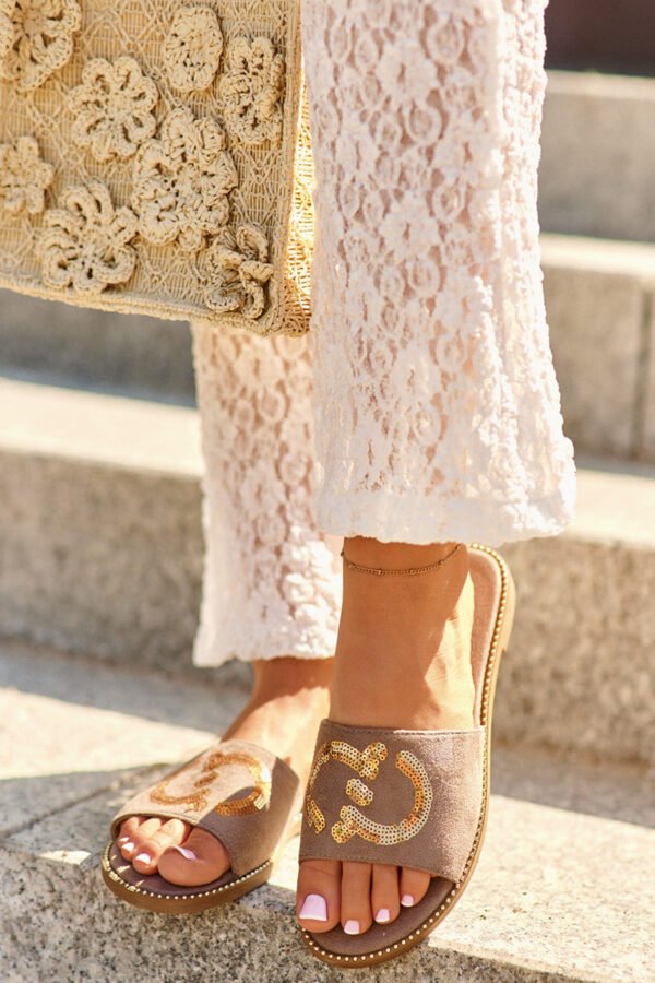 Moteriškos šlepetės pagamintos iš eko zomšo. Įtaisytos ant plokščio kulno. Dekoratyviniai blizgučiai ant dirželio suteikia žavesio. Minkštas „Comfort“ vidpadis leis patogiai avėti avalynę net visą dieną. Puikiai tinka atsitiktinėms (casual) stilizacijoms! Pasirinkdami dydį, prašome vadovautis dydžių lentele.