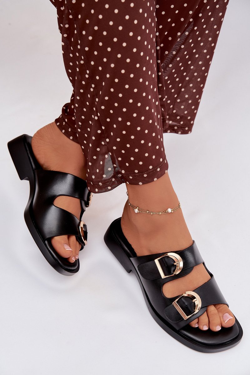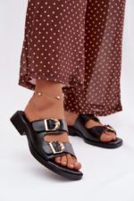 Moteriškos šlepetės iš ekologiškos odos – klasikinis pasirinkimas kasdienai. Modelis turi du dirželius su auksinėmis sagtimis, kurios suteikia visumui elegancijos ir stiliaus. Plokščias kulnas užtikrina patogumą ir laisvę vaikščiojant. Šlepetės puikiai tinka vasaros stiliams, derinamos tiek su suknelėmis, tiek su kasdieniais komplektais. Renkantis dydį, vadovaukitės dydžių lentele.