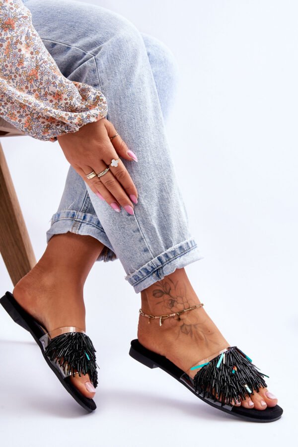 Madingos moteriškos šlepetės pagamintos iš plastiko viršaus. Įmontuotos ant plokščio kulno su neslystančiu padu. Šis modelis tikrai patiks kiekvienai moteriai, vertinančiai stilių ir patogumą. Šlepetės dekoruotos karoliukais ir plastikinėmis kutelėmis. Minkštas „Comfort“ vidpadis pagamintas iš eko zomšos, leidžiančio patogiai nešioti avalynę. Pasirinkdami dydį, prašome vadovautis dydžių lentele.