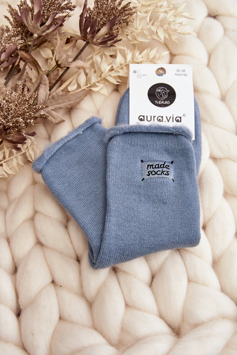 Šiltos moteriškos kojinės, idealiai tinkančios šaltoms dienoms. Modelis su maža aplikacija. Lengvas raištukas užtikrins, kad jos puikiai priglustų prie kojos storumo. Būtinai jas įsigykite!