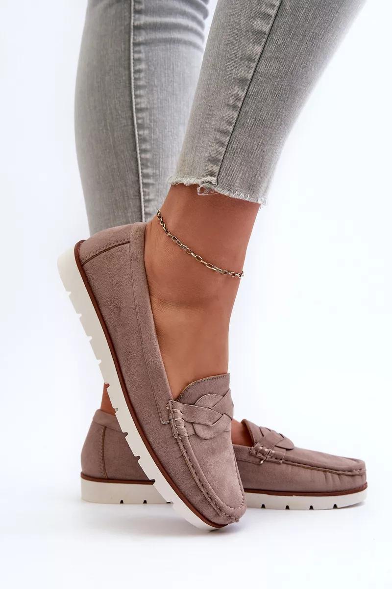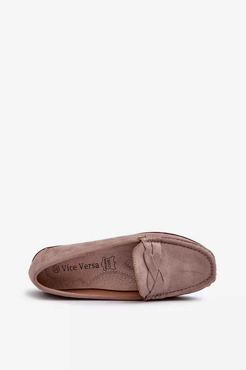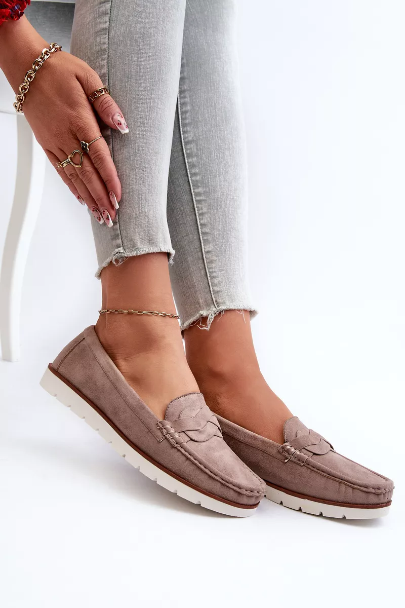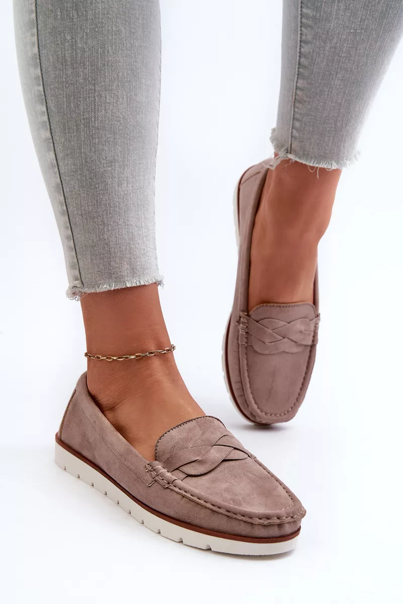 Šie dailios damų tamsiai smėlio spalvos mokasinai pagaminti iš aukštos kokybės dirbtinio zamšo. Jų priekis yra subtiliai dekoruotas susuktais dirželiais, suteikiančiais modelio elegancijos ir unikalumo. Mokasinų priekinės dalies išlenkimas sukuria patogumo jausmą, leidžiantį nevaržomai judėti.