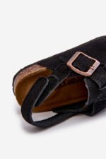Muzuliniai šlepetukai su kamštienos platforma. Pagaminti iš eko zomšos. Uždara priekinė dalis užtikrina papildomą apsaugą, o su lipuku segamas dirželis gale garantuoja puikų prigludimą ir stabilumą. Šie šlepetukai derina funkcionalumą su madinga išvaizda, todėl puikiai tinka kasdieniams pasivaikščiojimams ir žaidimams lauke. Renkantis dydį, prašome vadovautis dydžių lentele.