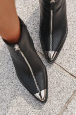 Moteriški eko odos botai yra stilingas pasirinkimas kasdienai ir iškilmingesnėms progoms. Stabilus blokas užtikrina patogų žingsnį, o šoninis užtrauktukas leidžia greitai apsiauti ir priglausti prie pėdos. Papildomas dekoratyvinis priekinis užtrauktukas ir subtili metalinė detalė suteikia modernumo. Rinkdamiesi dydį, prašome vadovautis dydžių lentele.