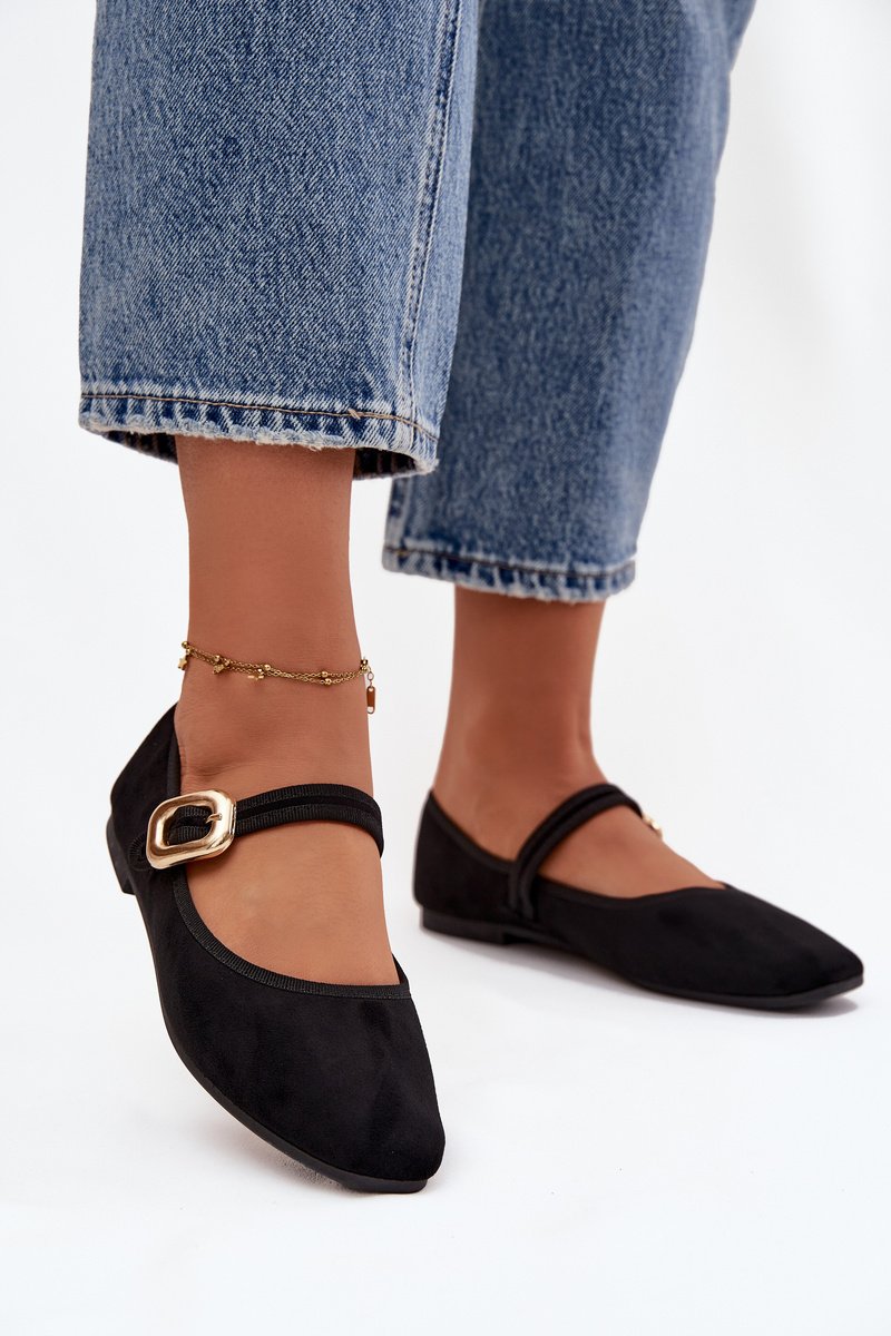 Moteriški balerininiai bateliai pagaminti iš minkšto eko zomšos. Plokštakulnis modelis užtikrina patogumą visą dieną, o švelniai suapvalinti pirštai suteikia subtilų, moterišką charakterį. Per vidurį yra dirželis su auksine sagtimi, kuri traukia akį ir suteikia elegantišką apdailą. Minkštas vidpadis užtikrina patogumą vaikščiojant. Tai klasikiniai, bet tuo pačiu stilingi balerininiai bateliai, kurie tiks įvairioms progoms – nuo kasdienių iki elegantiškų. Idealūs darbui, susitikimams ar pasivaikščiojimams. Rinkdamiesi dydį, prašome vadovautis dydžių lentele.