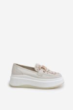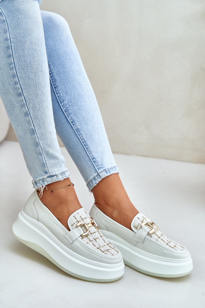 Elegantiškos moteriškos mokasinės pagamintos iš natūralios odos – puikus pasirinkimas moterims, vertinančioms klasikinį stilių su moderniu akcentu. Pastatytos ant platformos. Priekyje, ant batviršio, yra auksinė detalė, suteikianti joms išskirtinumo. Apvalūs priekiai. Idealiai tinka tiek kasdienėms, tiek formalesnėms progoms. Rinkdamiesi dydį, prašome vadovautis dydžių lentele.