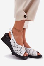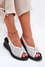 Ažūriniai moteriški sandalai, pagaminti iš natūralios odos – tai elegancijos ir komforto derinys. Įkalti ant platformos, jie užtikrina patogumą ir stabilumą visą dieną. Priekyje yra subtilus dekoratyvinis elementas, suteikiantis jiems charakterio. Sagtis leidžia puikiai priderinti prie kojos. Odinis vidpadis garantuoja dėvėjimo komfortą, todėl šie sandalai yra puikus pasirinkimas vasaros įvaizdžiui. Puikiai tinka šiltoms dienoms, sujungia funkcionalumą su madinga išvaizda. Rinkdamiesi dydį, prašome vadovautis dydžių lentele.