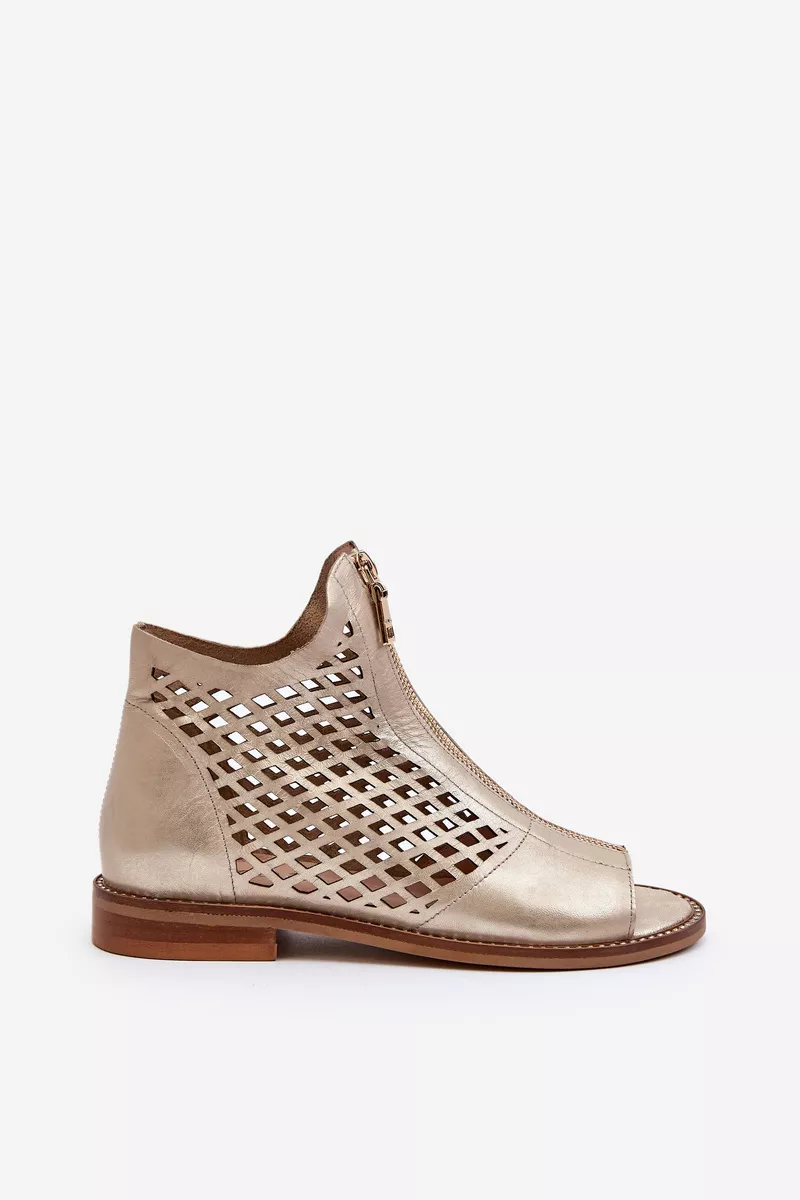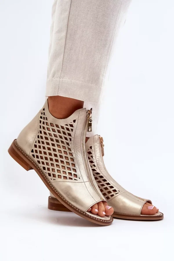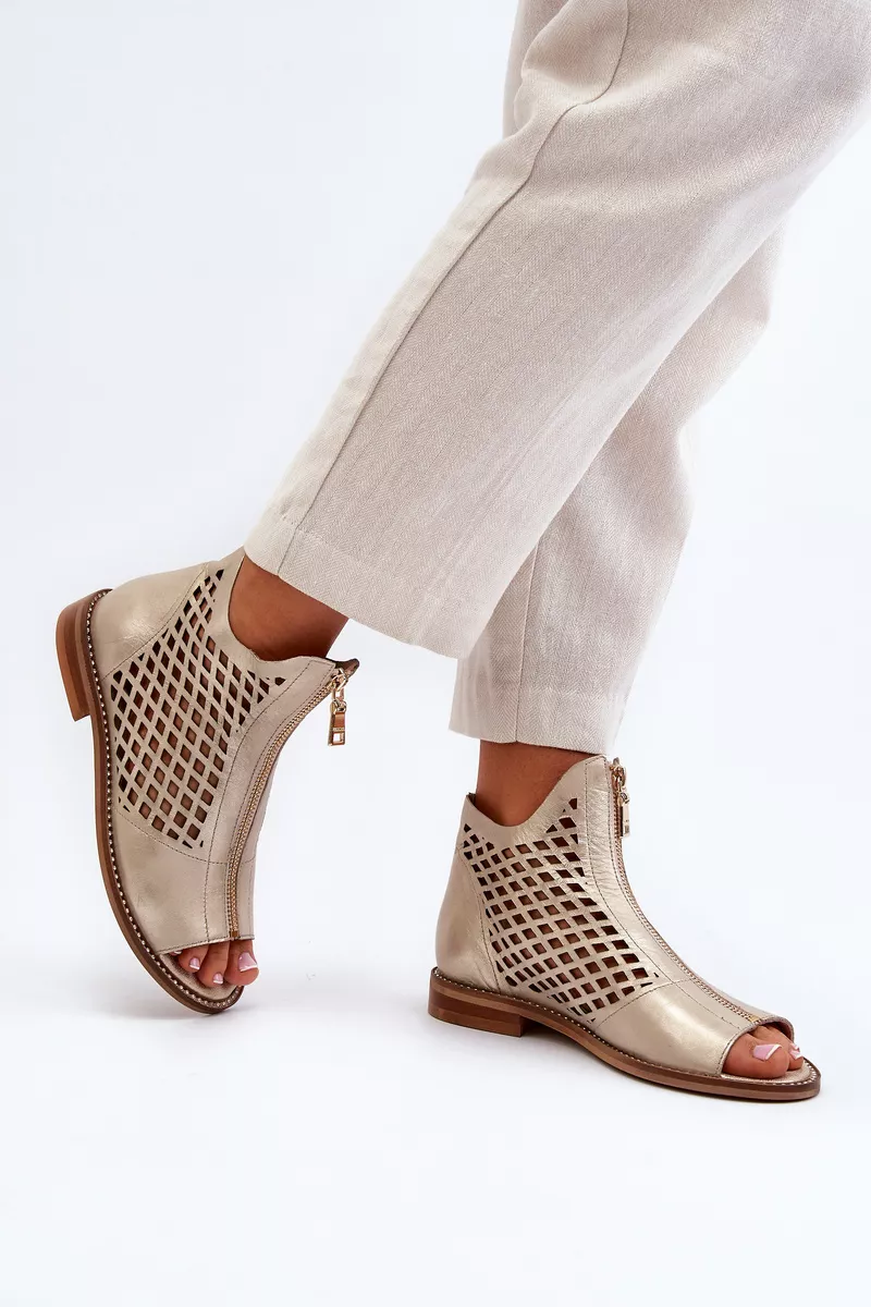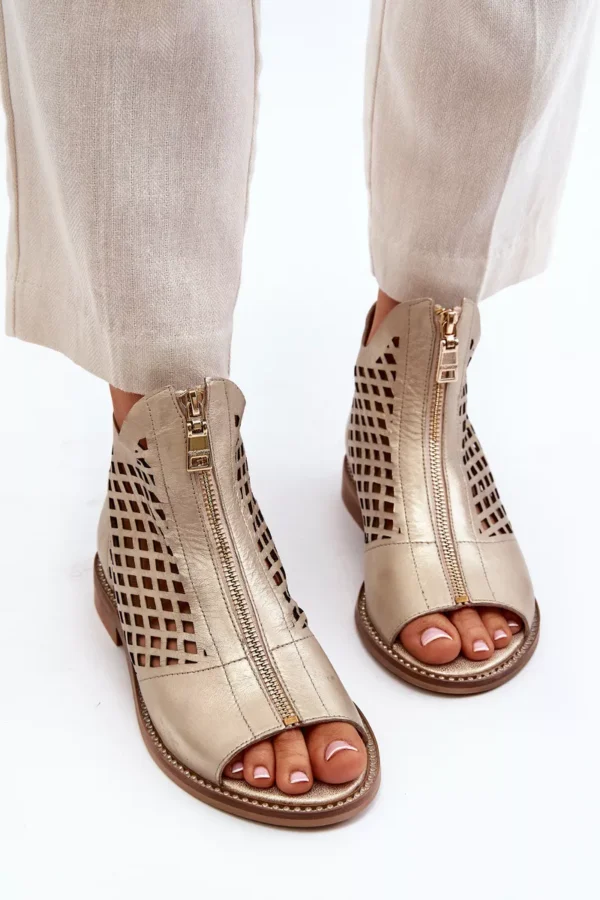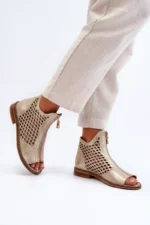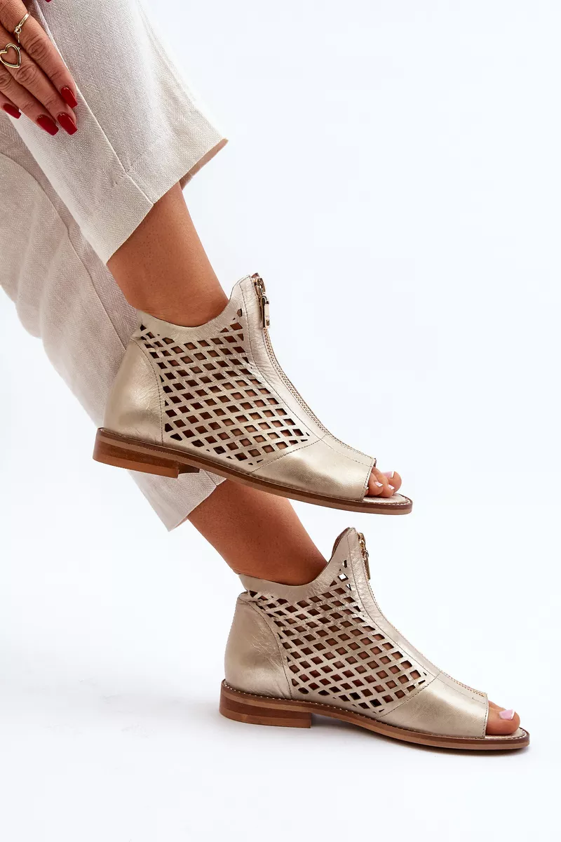 Šie sandalai išsiskiria glotnia oda ir rafinuotomis detalėmis, tokiomis kaip auksiniai papuošimai ir dekoratyviniai užtrauktukai. Kulnas yra žemas, todėl šie sandalai yra puikūs pasirinkimas tiek kasdieniam dėvėjimui, tiek ypatingoms progoms.