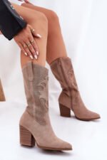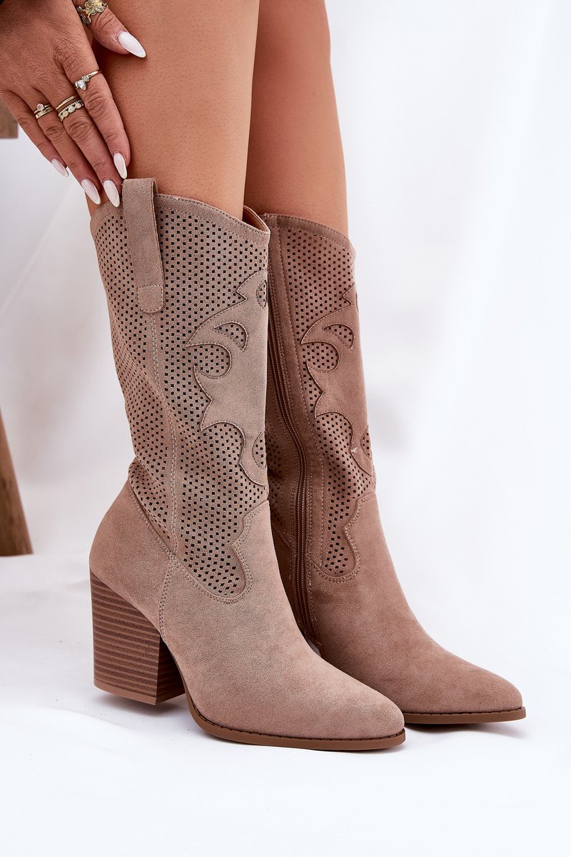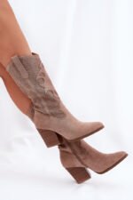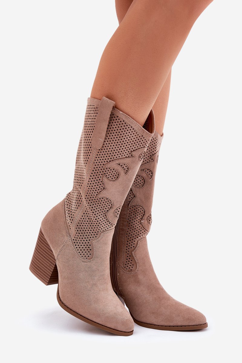 Moteriški kaubojiški batai, “S.Barski” prekės ženklo. Pagaminti iš eko zomšo, derinantys eleganciją su originaliu stiliumi. Ažūrinis batviršis suteikia lengvumo ir charakterio. Migdoliniai aulinukai. Užsegami užtrauktuku. Batviršis siekia iki pusės blauzdos. Šiuos stilingus batus galite naudoti laisvalaikio ir boho stiliaus deriniams. Pasirinkdami dydį, vadovaukitės dydžių lentele.