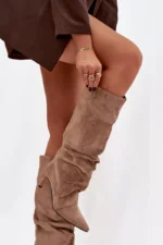 Mavella moteriški batai – tai moteriškos elegancijos ir madingo stiliaus esmė. Pagaminti iš minkšto ekologiško suede, gilaus smėlio atspalvio, jie yra puikus pasirinkimas šaltesnėms dienoms. Subtilus blizgesys ir raukšlėta viršutinė dalis suteikia jiems unikalų charakterį, o plonas kulnas gražiai pabrėžia kojas ir lieknina figūrą. Šis modelis derina madingą išvaizdą ir funkcionalumą, suteikdamas klasės ir rafinuotumo bet kokiam aprangos deriniui.