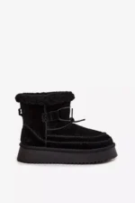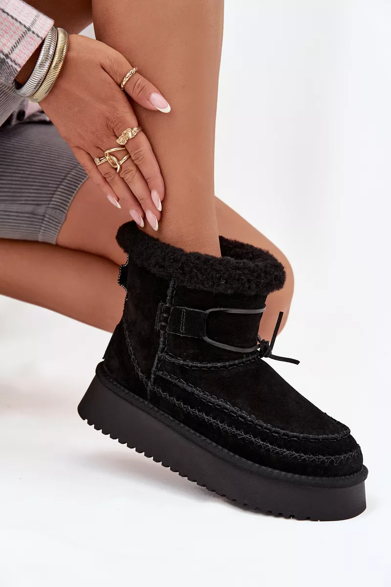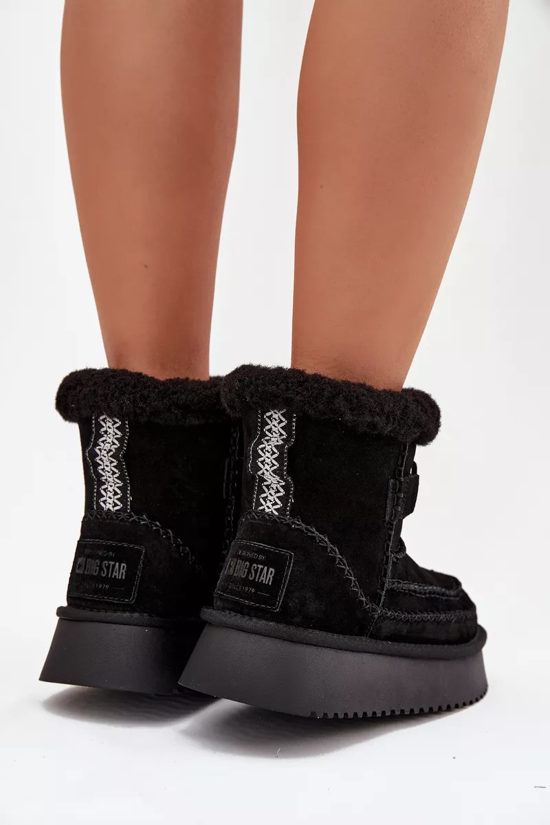Moteriški sniego batai iš Big Star. Pagaminti iš aukštos kokybės natūralaus zomšo, jie atrodo patvarūs ir elegantiški, o stabili platforma užtikrina tvirtą žingsnį ir papildomą izoliaciją nuo šalto pagrindo. Viršus, puoštas siūlėmis, suteikia madingą charakterį, išskiriantį juos kasdienėse stilizacijose. Įsispiriamas dizainas leidžia greitai apsiauti, o vidus, apšildytas avikailiu, garantuoja komfortą ir šilumą net ir šalčiausiomis dienomis. Šie sniego batai puikiai tiks tiek miesto pasivaikščiojimams, tiek savaitgalio išvykoms žiemos dienomis. Renkantis dydį, vadovaukitės dydžių lentele.