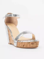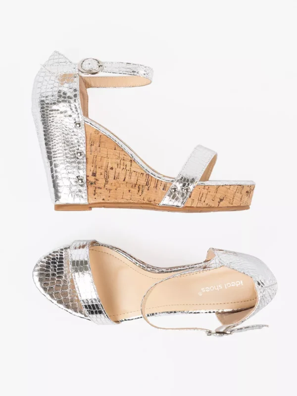 Sidabriniais blizgesiais dekoruoti pleišto formos platformos sandalai yra ne tik mados, bet ir komforto ikona. Jų aukštos kokybės kamštinės platformos prisitaiko prie natūralaus kojos linkio, kas padeda sumažinti nuovargį net po ilgo dėvėjimo. Šios basutės yra idealus sprendimas, jei norite pridėti kelių centimetrų ūgį be aukštakulnių diskomforto.